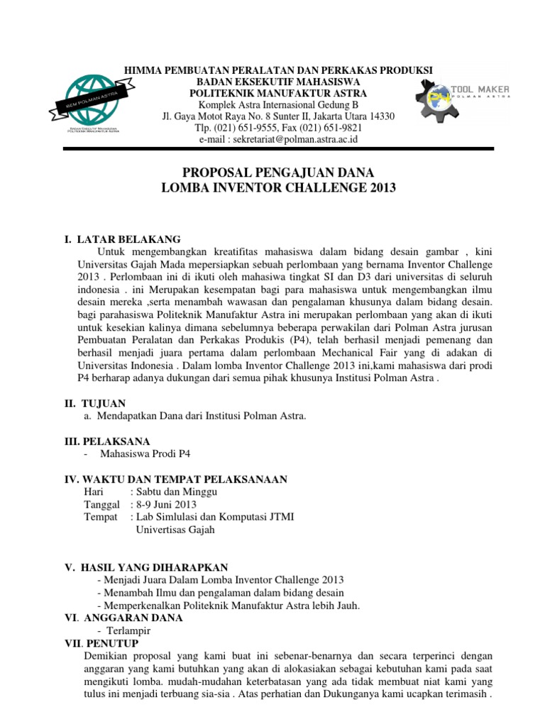 26 Jan 2020 — Proposal kegiatan juga memiliki fungsi sebagai alat mengajukan permohonan dana kepada instansi, organisasi atau kepada pihak lain yang sekiranya ... 13 Apr 2020 — Demikian surat permohonan bantuan simpanan kegiatan Lomba Jalan Santai Mahasiswa ... Contoh Surat Pengantar Proposal Berbagai Kepentingan. 28 Oct 2018 — PROPOSAL PENGAJUAN DANA PENELITIAN BETON (Lomba Inovasi Beton Civilweek 2016 UNS) Fakultas Teknik Universitas Bandar Lampung Lampung 2016