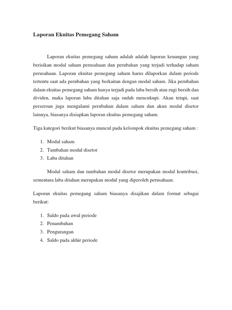 Laporan ekuitas pemegang saham. Sedangkan pergerakan cadangan pemegang saham dapat diamati dari neraca, laporan perubahan ekuitas mengungkapkan informasi signifikan tentang cadangan ekuitas yang tidak disajikan secara terpisah dalam laporan keuangan yang mungkin berguna dalam memahami sifat perubahan dalam cadangan ekuitas suatu entitas bisnis. Merupakan laba dan juga rugi yang akan didistribusikan pada masing-masing pemegang saham seperti apa yang sudah tercantum pada laporan laba rugi seperti yang sudah kami sajikan di atas. Demikian informasi yang bisa kami sampaikan mengenai pengertian, komponen, dan bagaimana cara membuat laporan keuangan perubahan ekuitas atau modal. Laporan Lawatan Sambil Belajar Ke Pameran Buku. bahasa. ADSI. RPP 1 NEW .docx. rumus mencari keaktifan. Soal Tugas Sp Mat Tek . Soal Tugas Sp Mat Tek. Soal. kode_barang. Resume Pertemuan Terakhir (1) RPP-Mat-Diskret-UMM-SETIADI.docx. New Text Document.txt. kamus. Download now. Jump to Page . You are on page 1 of 1384. Search inside document . a aa ab aba aba-aba abad … informasi oleh pemegang saham tertentu, perlu mengganti Peraturan Otoritas Jasa Keuangan Nomor 60/POJK.04/2015 tentang Keterbukaan Informasi Pemegang Saham Tertentu; b. bahwa berdasarkan pertimbangan sebagaimana dimaksud dalam huruf a, perlu menetapkan Peraturan Otoritas Jasa Keuangan tentang Laporan Kepemilikan