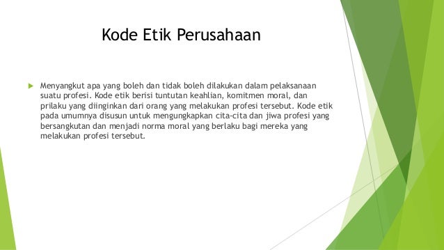 Oct 13, 2017 · Kode etik profesi merupakan suatu tatanan etika yang telah disepakati oleh suatu kelompok masyarakat tertentu. Kode etik umumnya termasuk dalam norma sosial. Kode Etik juga dapat diartikan sebagai pola aturan, tata cara, tanda, pedoman etis dalam melakukan suatu kegiatan atau pekerjaan.