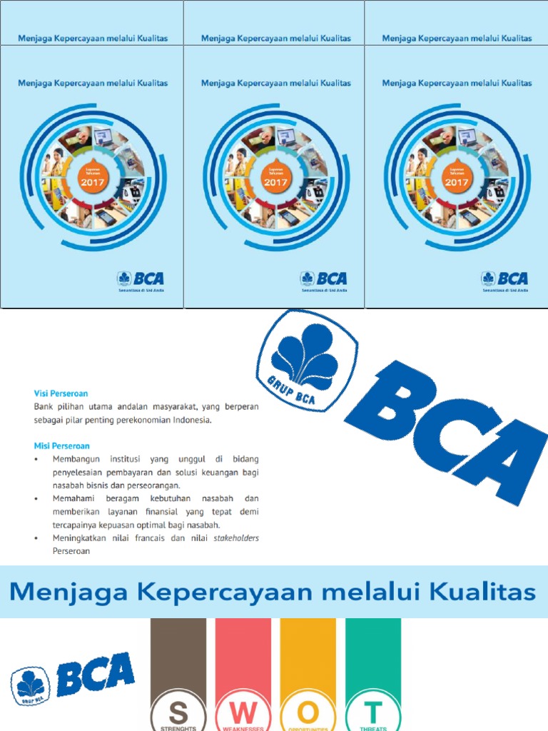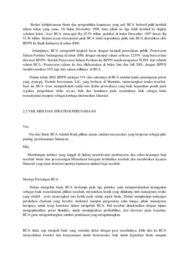 by CUTI SETIAWATI · 2017 · Cited by 2 — Begitu juga di Bank Central Asia (BCA) Cabang Metro Indah. Mall (MIM) Bandung. ... id/about/caritahu-tentang-bca/visi-misi/ visimisi_landing.jsp.8 pages PT. Bank Central Asia Tbk. atau lebih dikenal dengan BCA, adalah bank swasta terbesar di Indonesia. Bank ini didirikan pada 21 Februari 1957 dengan nama Bank Central Asia NV dan pernah menjadi bagian penting dari Salim Group. Sekarang bank ini dimiliki oleh salah satu grup perusahaan rokok terbesar di dunia, Djarum. Selama 60 tahun BCA tak