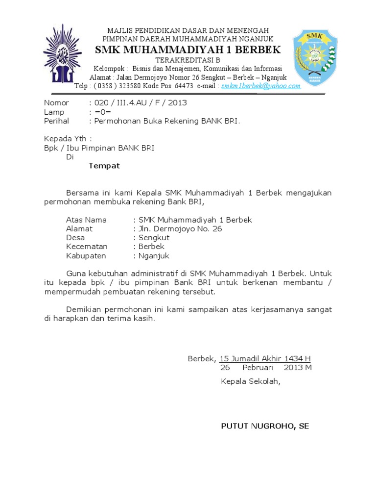 Contoh Surat Permohonan Penerbitan Rekening Bank Kelompok Tani. 0 minute read. Berikut ini contoh surat permohonan penerbitan rekening bank sebagai pengantar atas pembuatan rekening bank suatu kelompok tani atau kelompok usaha rakyat lainnya. UNDUH FILE DISINI. Admin dari blog Kumpulan Contoh Surat 2019 juga mengumpulkan gambar-gambar lainnya terkait contoh surat permohonan pembukaan rekening lembaga dibawah ini. Doc Surat Rekomendasi Pembukaan Rekening Bank Titi. Untitled. Surat Permohonan Buka Rekening Baru Perusahaan. SURAT REKOMENDASI PEMBUKAAN REKENING BANK Kepada Yth Kepala Cabang Bank BCA Cabang. Gading Serpong. Dengan Hormat, Yang bertanda tangan dibawah ini : Nama : Henny Widjaya Jabatan : Finance Dengan ini menerangkan bahwa : Nama : Titi Handayani No KTP : 3674035902890001 Alamat di KTP : Jl. M. Nurul Fajri Rt 005/003 Kel. Contoh Surat Permohonan Pembukaan Rekening. GRUP ARISAN YAYASAN IBU PKK. Alamat : Desa Pijerpodi RT.03 RW.01 Madura, 11 Mei 2018 KEC./KAB. Mandou Madura. Kepada Yth : Bapak Pimpinan Cabang BNI Kota Madura Di , Tempat. Nomor : Lampiran : 1 (Satu) Berkas Perihal : Permohonan Pembukaan Rekening TABUNGAN
