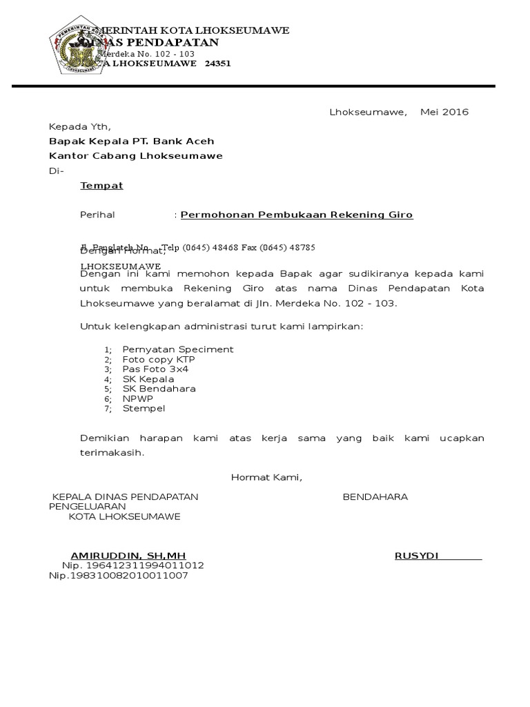Contoh surat permohonan pembukaan rekening giro - Rekening giro adalah jenis rekening yang banyak digunakan oleh instansi, sekolah, CV, yayasan maupun perusahaan mengingat banyaknya aktivitas transaksi perbankan yang dilakukan di bank konvensional seperti Bank Jatim, Mandiri, BRI, BTPN, BJB. Pada dasarnya rekening tabungan dan rekening giro hampir sama secara penggunaan, hanya saja rekening ... August 8, 2017 - Contoh Surat Permohonan Buka Rekening baru perusahaan by w7ainur7rachman Informasi mengenai Contoh Surat Permohonan Pembukaan Rekening Bumdes. Http Etheses Uin Malang Ac Id 11809 1 14130051 Pdf. Sumber Gambar : google.com. Doc Standar Operasional Prosedur Sop Badan Direksi Bumdes. Sumber Gambar : google.com. Permohonan Buka Rekening Doc. Sumber Gambar : google.com. Adalah benar karyawan CV. Chair Auto Car Rent. posisi sebagai Driver. Demikian Surat Keterangan Kerja ini kami buat guna keperluan pembukaan rekening di di Bank ...