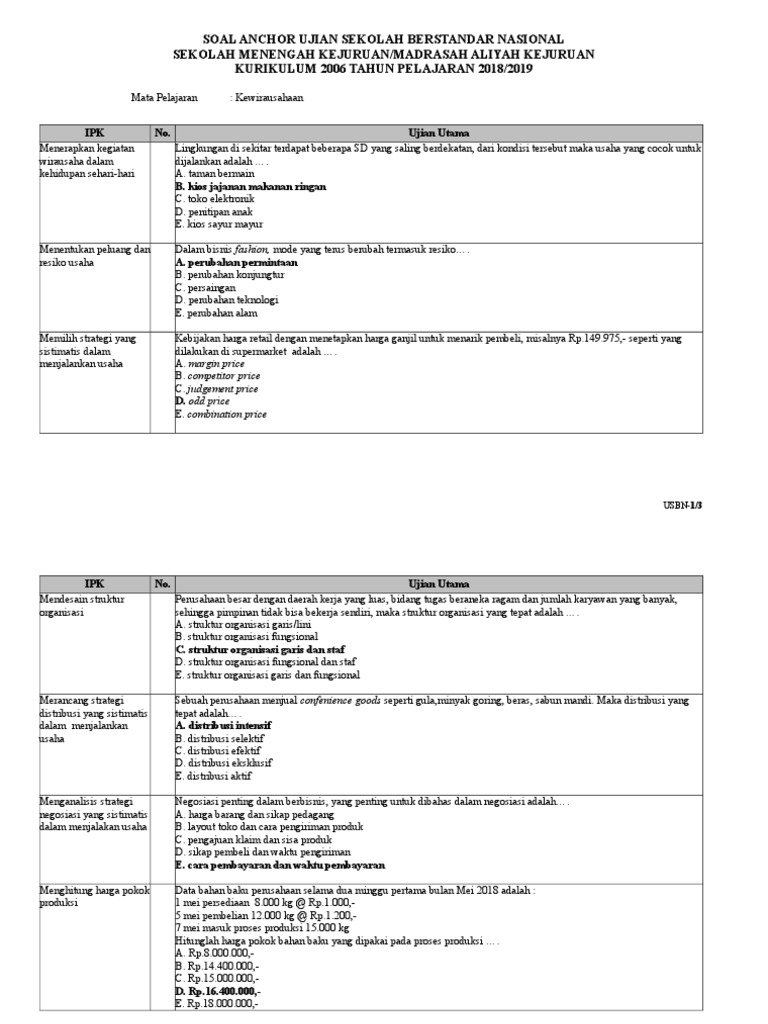 40 Questions Show answers. Q. Lingkungan disekitar terdapat beberapa SD yang saling berdekatan, dari kondisi tersebut maka usaha yang cocok untuk dijalankan adalah …. Q. Dalam bisnis fashion, mode yang terus berubah termasuk resiko ….