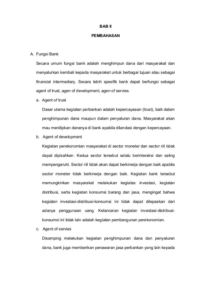 Dimana tujuan bank secara umum yaitu membantu pelaksanaan pembangunan nasional demi tercapainya pemerataan, pertumbuhan ekonomi serta peningkatan kesejahteraan masyarakat. Dari tujuan di atas, maka peranan BANK TERBAIK DI INDONESIA wajib melaksanakan fungsi dan... Fungsi bank secara umum adalah menghimpun dana dari masyrakat luas(funding) dan menyalurkan dalam bentuk pinjaman atau kredit(lending) untuk berbagai tujuan. Mengenal Fungsi Bank Secara Umum Beserta Jenis-Jenisnya. 4 menit membaca Oleh CekAja pada October 16, 2019. Istilah 'bank' mungkin sudah tidak asing di telinga kita. Lembaga keuangan yang sering kali digunakan sebagai wadah untuk menyelesaikan berbagai permasalahan finansial ini...