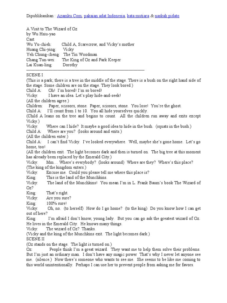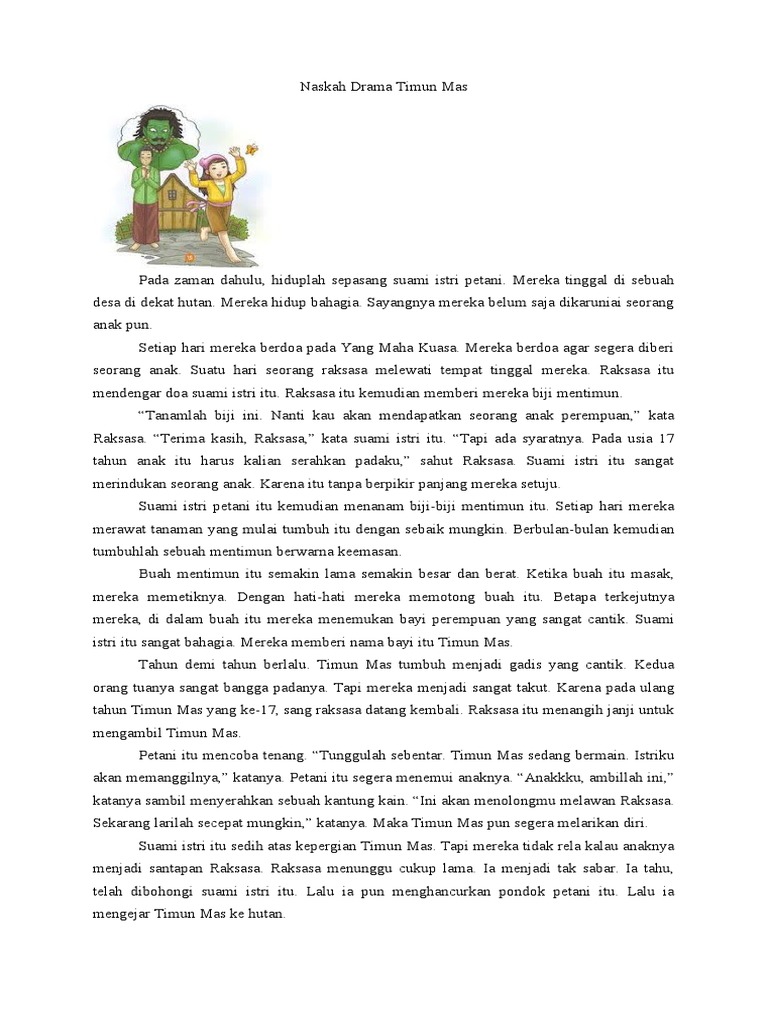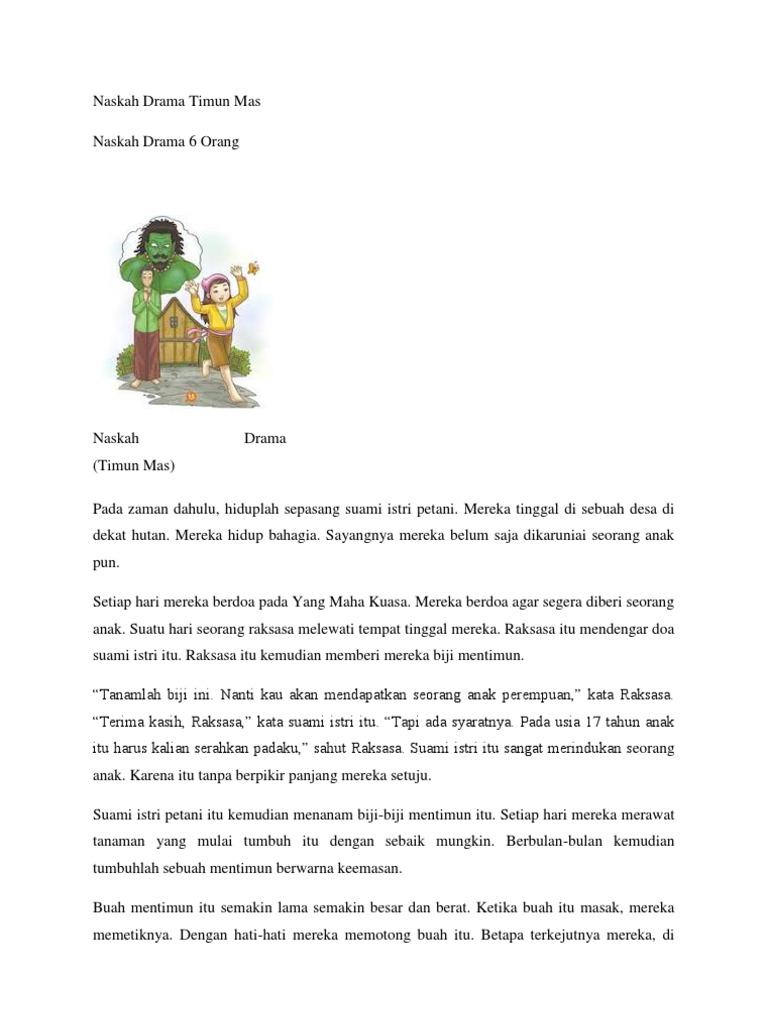 Naskah drama timun emas. Naskah Drama Timun Mas dalam Bahasa Inggris - Berikut terdapat naskah drama yang berkisah mengenai Timun Mas. Characters: Old man Farmer : The father of. Rating: 5 · 234 votes Jun 6, 2018 — Timun Mas Naskah Drama Timun Mas dalam Bahasa Inggris Kakak Pintar. Once upon a time in Java, there was a poor widow named Mbok Srini that ... Apr 4, 2021 — Contoh Cerita Rakyat dalam Bahasa Inggris Cerita Keong Mas Golden Snail. ... Naskah Drama Cerita Rakyat Jawa tengah Timun Emas Rating: . Naskah Drama Bahasa Inggris Timun Mas - Free download as Word Doc (.doc / .docx), PDF File (.pdf), Text File (.txt) or read online for free. welej.