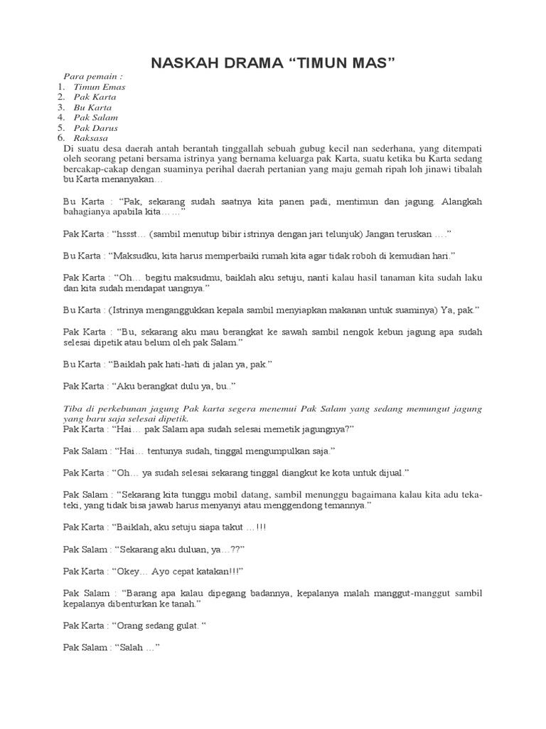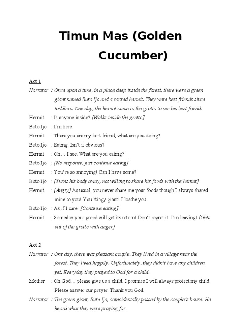 Slide 3 of 3 of Timun mas. ... The holy man SK NADAK Timun Emas then reached the third bag and spilled the salt on the ground ... Naskah drama Timun Emas. Naskah Drama Timun Mas dalam Bahasa Inggris Post views: A long time ago, there is life wife and husband farmer. They are live in the village near of the ...