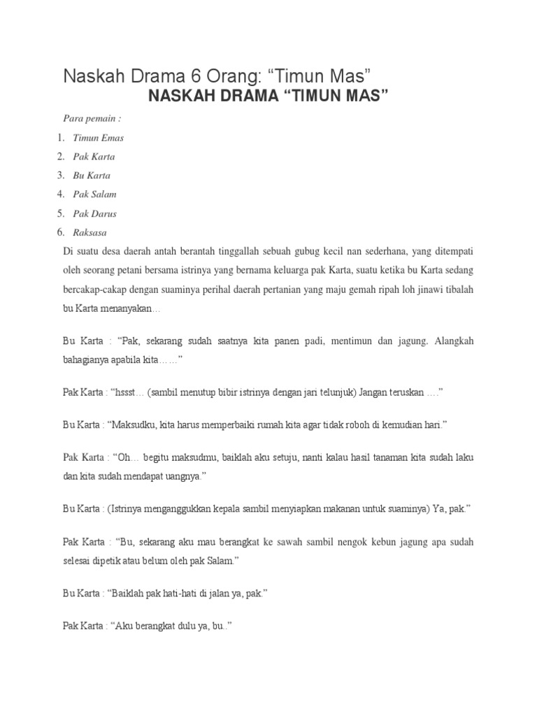 Cerita Rakyat Dongeng Timun Mas Indonesia Dan Inggris.. Drama Bahasa Jawa TUKANG KORAN. ... Dialog Naskah Drama Timun Emas Dalam Bahasa Jawa Wattpad. Contextual translation of "naskah timun mas 8 orang" from Indonesian into Javanese. ... Indonesian. naskah drama legenda jawa 8 orang pemain laki laki ... Nov 24, 2012 — Berikut ini adalah naskah drama Bahasa Inggris kelompokku saat mengikuti ujian praktek akhir. Judulnya “The Tale of Timun Mas”, ...