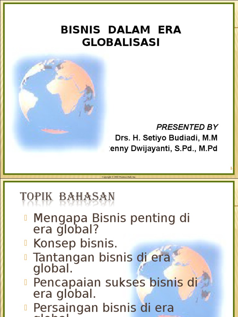 Persaingan bisnis di era globalisasi. Era globalisasi di abad 21 ini, persaingan bisnis antar perusahaan semakin ketat baik di pasar domestik maupun internasional. Perusahaan yang. Di era globalisasi ini bisnis ruang lingkup bisnis sudah luas, setiap perusahaan bahkan setiap orang berhak mendapatkan peluang membuka suatu bisnis dimulai dari yang kecil hingga bisnis yang besar sehingga mendapatkan hasil yang maksimal dan saling mendapatkan keuntungan antara kedua belah pihak. Dalam era globalisasi, persaingan bisnis menjadi semakin tajam, baik dipasar domestik (nasional) maupun internasional. Perkembangan. Manajemen strategi menyongsong era globalisasi yang dapat diterapkan di perusahaan- perusahaan antara lain: Persaingan global dengan lini yang luas Fokus global Fokus nasional Ceruk yang terlindung Analisis lingkungan eksternal Analisis lingkungan internal Strategi tingkat bisnis Strategi tingkat perusahaan Strategi akuisisi dan restrukturisasi ...