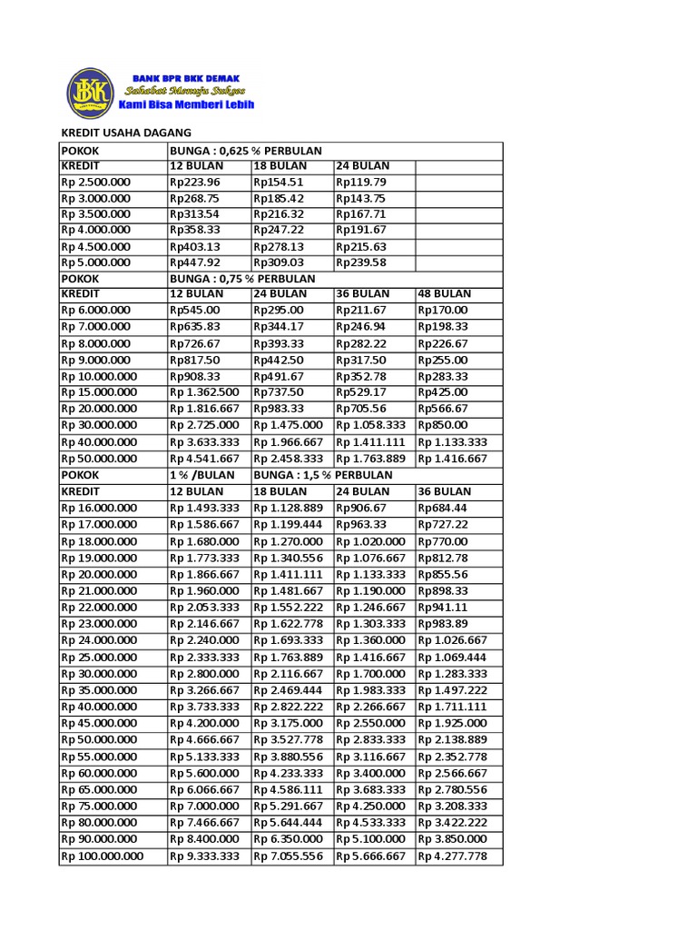 Tabel angsuran pinjaman BNI 2019 - Bila anda termasuk nasabah yang memilih untuk mengajukan kredit tanpa agunan melalui Bank BNI baik jenis KTA Fleksi maupun Payroll tentu bertanya-tanya bagaimana simulasi yang akan menggambarkan jumlah cicilan bulanan untuk masa pinjaman dalam waktu tertentu misal 1 tahun 2 tahun atau 3 tahun.Untuk itu ada kalanya kita membutuhkan simulasi kredit sebagai ... Tabel Angsuran KPR BSI Hasanah 2021 – Kredit pemilikan rumah atau KPR adalah salah satu layanan terkini dari Bank Syariah Indonesia (BSI). Dimana nama fasilitas pembelian rumah dari BSI sendiri yakni Griya Hasanah. BANK PERKREDITAN RAKYAT BKK DEMAK (PERSERODA) KAB DEMAK Ayo… Ke BANK BPR BKK DEMAK Kantor Pusat : Jalan Demak Kudus RT 5 RW 9 Kab. Demak. Telp. / Fax : (0291) 685961 Email : bprbkkdemak@yahoo.co.id DAFTAR ANGSURAN KREDIT KREDIT USAHA DAGANG KREDIT MUSIMAN : 6 BULAN LUNAS POKOK BUNGA : 0,625 % PERBULAN POKOK BUNGA 2 % PERBULAN KREDIT 12 BULAN 18 BULAN 24 BULAN KREDIT PERBULAN PELUNASAN Rp 2 ...