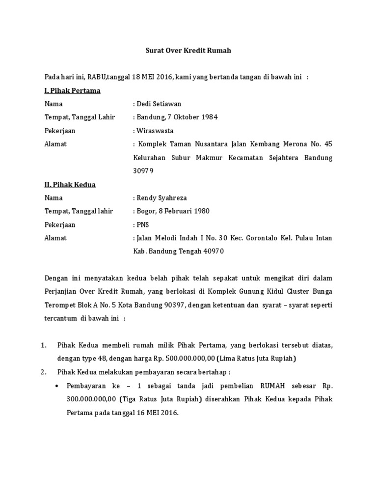 Contoh Surat Perjanjian Over Kredit Rumah Bawah Tangan Delinews Tapanuli