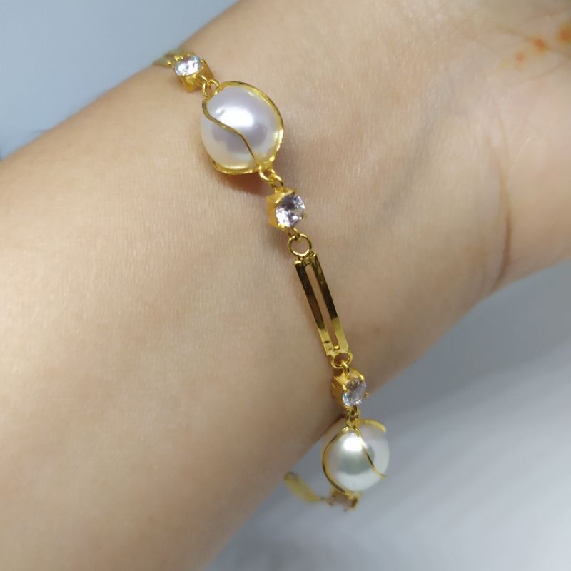 Gelang Emas Kombinasi Batu Manik-manik Lombok Gelang emas seberat 4,5 gram ini menggunakan bahan baku perak yang dilapis emas 22 karat. Bentuknya sangat kental dengan unsur etnik khas Lombok. Anda bisa mendapatkannya melalui www.jualmutiara.net dengan harga Rp 2.800.000. Set Kalung Dan Gelang Mutiara Rodium Lapis Emas Kombinasi Batu