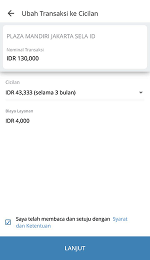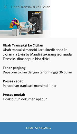 Tagihan kartu kredit mandiri jadi cicilan. Change PIN Number through digibank by DBS App. Transaksi Kartu Kredit Aman Pakai PIN. Ubah transaksi dan tagihan jadi cicilan biar cashflow tak terganggu ... Aplikasi pinjaman uang online KTA cepat tanpa agunan/jaminan. Lakukan Pinjaman Tanpa Agunan dengan nyaman bersama Easycash. Produk Pinjaman Rating: 4.4 · 736,912 votes · Free · Android · Finance Mulai per tanggal 18 Agustus 2020, pembayaran minimum akan berubah menjadi : Pembayaran minimum 5% dari tagihan baru ditambah cicilan tetap (bila ada), dan/atau ... - Bukti Pembayaran dalam bentuk STRUK agar disimpan sebagai bukti pembayaran yang sah dari Bank Mandiri. 5 ATM Maybank. -Masukkan kartu Atm Maybank dan no pin - ...