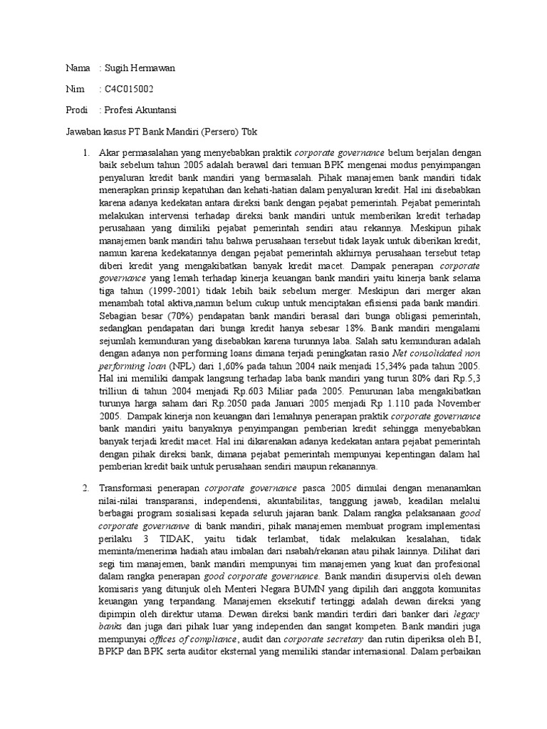Kasus gcg bank mandiri. 31/01/2022 TRIBUNNEWS.COM - Jadwal Badminton Asia Team Championships 2022 atau BATC 2022 akan bergulir pada 15 hingga 20 Februari 2022. Indonesia memutuskan untuk mengirimkan para pebulu tangkis mudanya untuk berlaga di ajang ini. Pelanggan KFC yang membeli menu big original 2 dan minimal transaksi Rp 60.500 akan memperoleh satu potong ayam secara gratis. Promo ini berlaku tiap Sabtu. Sementara itu untuk Taco Bell, pelanggan yang membeli menu loaded nachos beef dengan minimal transaksi Rp 75 ribu akan mendapatkan menu chocodila secara gratis.. Bank Mandiri, kata Thomas, akan meningkatkan transaksi non-tunai melalui ... Membelinya enggak harus secara cash kok, bisa juga secara kredit. Sekadar informasi, melansir Honda-indonesia.com Honda Brio Satya hadir dalam 3 pilihan tipe.. Honda Brio Satya S M/T, Honda Brio Satya E M/T, dan Honda Brio Satya E CVT.