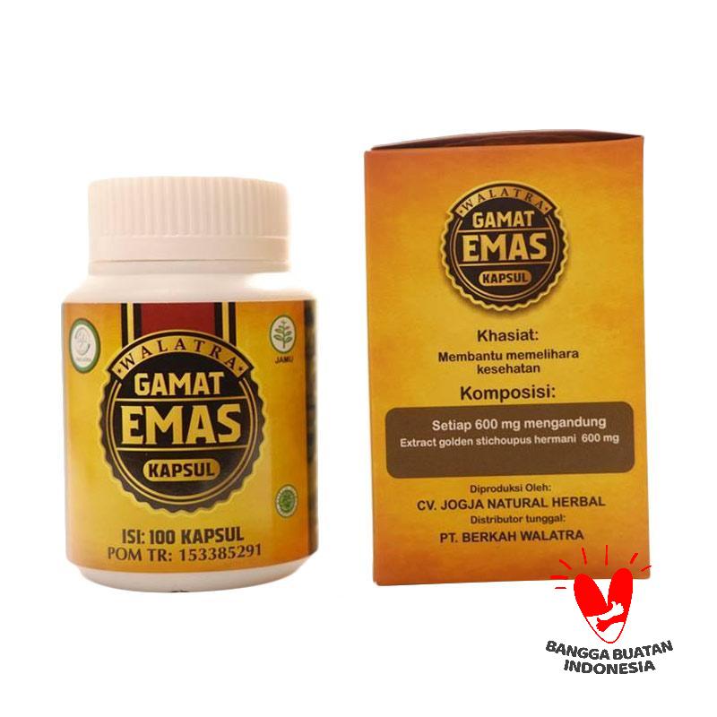 Khasiat dan Manfaat Walatra Kapsul Gamat Emas Untuk Kesehatan Manusia. Walatra Gamat Emas kapsul berkomposisi golden stichopus hermani, yaitu sebuah hewan di dasar laut yang berbentuk seperti timun memanjang bulat dan bergerigi. Hewan ini mempunyai keunikan yaitu apabila tubuhnya terluka maka akan bisa sembuh secara cepat hanya dalam hitungan jam.