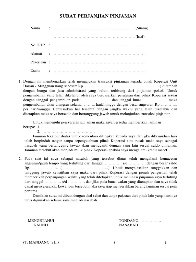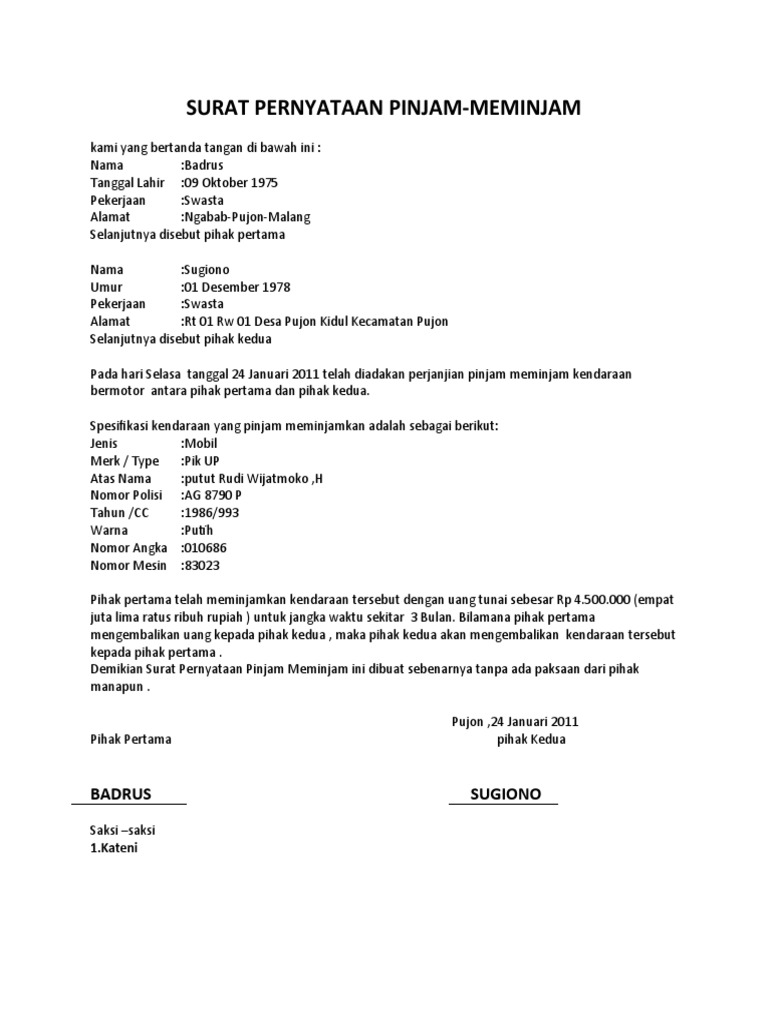 Surat pernyataan tersebut dinamakan dengan surat pinjaman uang. Surat peminjaman uang adalah sebuah surat pernyataan yang dibuat oleh peminjam sebagai pernyataan dirinya karena telah meminjam uang kepada seseorang, lembaga maupun perusahaan yang dijadikan sebagai bukti apabila di kemudian hari menimbulkan perselisihan. Surat pernyataan pinjaman uang dan jaminan gadai. Nah, penting nih untuk mempunyai surat perjanjian pinjaman uang kalau urusan pinjam meminjam. Penerima pinjaman berkewajiban mengembalikan hak milik pemberi pinjaman baik itu uang atau properti tergantung dari kesepakatan dalam surat .