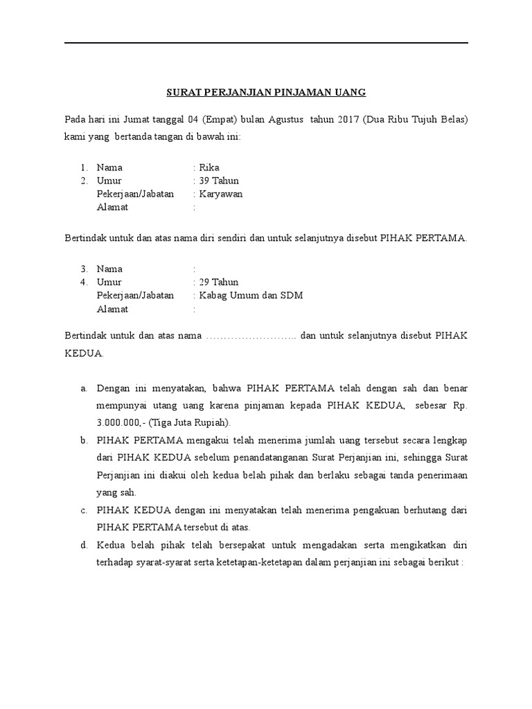 Surat Perjanjian September 29, 2021 18:54. Contoh Surat Perjanjian Hutang Piutang - Persoalan utang-piutang bukanlah hal yang asing dalam kehidupan kita sehari-hari. Banyak orang yang terpaksa melakukan proses hutang demi memenuhi kebutuhan hidup mereka. Hutang tersebut dapat diperoleh dari perseorangan maupun dari pihak instansi seperti bank. Jan 13, 2022 · Surat perjanjian pelunasan hutang ini memiliki peran yang sangat penting bagi kedua belah pihak yang terlibat hutang piutang. Kedua belah pihak yang terlibat adalah peminjam dan pemberi pinjaman. Dalam surat perjanjian pelunasan hutang, hak dan kewajiban masing-masing pihak akan ditulis kan dengan rinci. Jabatan: Kepala Bagian Finishing PT. Mandiri Raya. Alamat : Jl. Brigjend Katamso No. 15E Yogyakarta. Bermaksud mengajukan permohonan pinjaman kepada perusahaan sebesar Rp 10.000.000,- yang akan saya gunakan untuk membayar uang gedung anak saya yang sedang masuk ke SMU tahun ini. Adapun besarnya cicilan pembayaran yang mampu saya lakukan adalah ... Kumpulan Contoh Surat Pernyataan Pinjam Uang Di Bank yang Baik 2019. Contoh Surat Pernyataan Pinjam Uang Di Bank have a graphic associated with the other.Contoh Surat Pernyataan Pinjam Uang Di Bank In addition, it will feature a picture of a sort that may be seen in the gallery of Contoh Surat Pernyataan Pinjam Uang Di Bank. The collection that comprising chosen picture and the best amongst others.