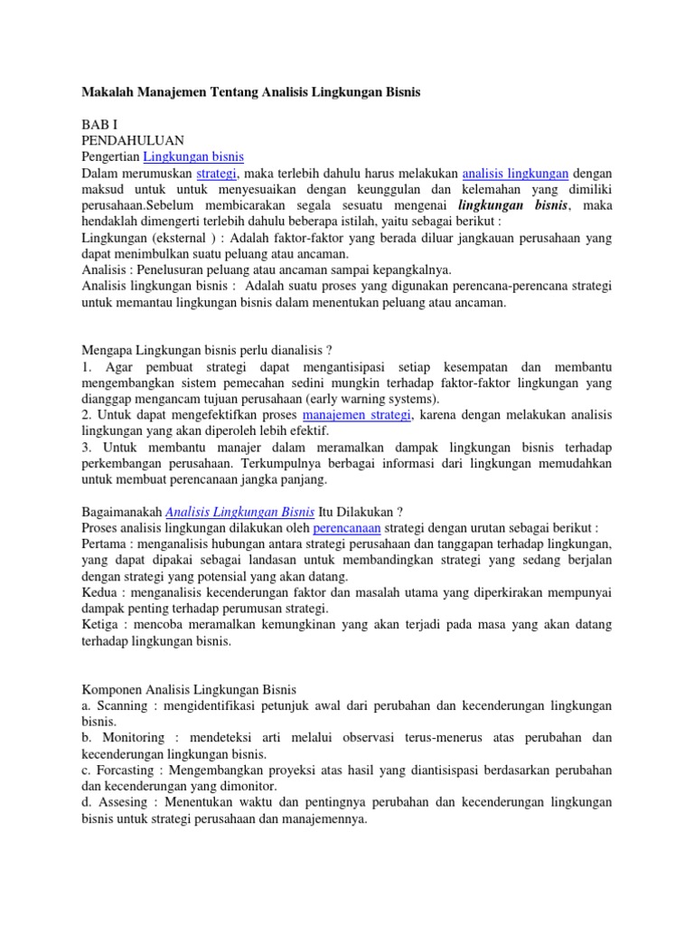 Makalah analisis lingkungan bisnis makro. Alhamdulillah,Segala puji syukur kehadirat Allah SWT, yang telah melimpahkan rahmat dan hidayah-Nya, sehingga kelompok kami dapat menyelesaikan makalah yang berjudul "Analisis Lingkungan Industri dan Persaingan". Penulisan makalah ini merupakan salah satu syarat untuk memenuhi tugas terstruktur Mata Kuliah Pemasaran. MAKALAH ANALISIS MANAJEMEN RISIKO PADA PT PERUSAHAAN GAS NEGARA (PERSERO) Tbk ... Lebih-lebih dalam dunia bisnis, ketidakpastian beserta risikonya merupan sesuatu yang tidak dapat diabaikan begitu saja, malah harus diperhatikan secara cermat. ... Lingkungan internal mencakup arahan dari perusahaan yang dapat mempengaruhi kesadaran stakeholders ... Lingkungan eksternal yang akan dianalisis akan mempengaruhi perkembangan dan dinamika dari makro ekonomi Indonesia dan industri katering di Indonesia yang sedang dan akan terjadi dalam kjangka waktu 3 tahun kedepan. Pada analisis eksternal akan mendapatkan dua fakta yaitu peluang dan ancaman yang dapat berdampak pada keberlangsungan bisnis ... Suwarsono (2017) menjelaskan bahwa analisis lingkungan bisnis terdiri dari dua komponen yaitu analisis lingkungan makro dan analisis lingkungan industri (competitive environment).Analisis lingkungan bisnis makro meliputi beberapa lingkup seperti lingkup ekonomi, teknologi, politik (pemerintah), hukum, sosial budaya dan kependudukan.