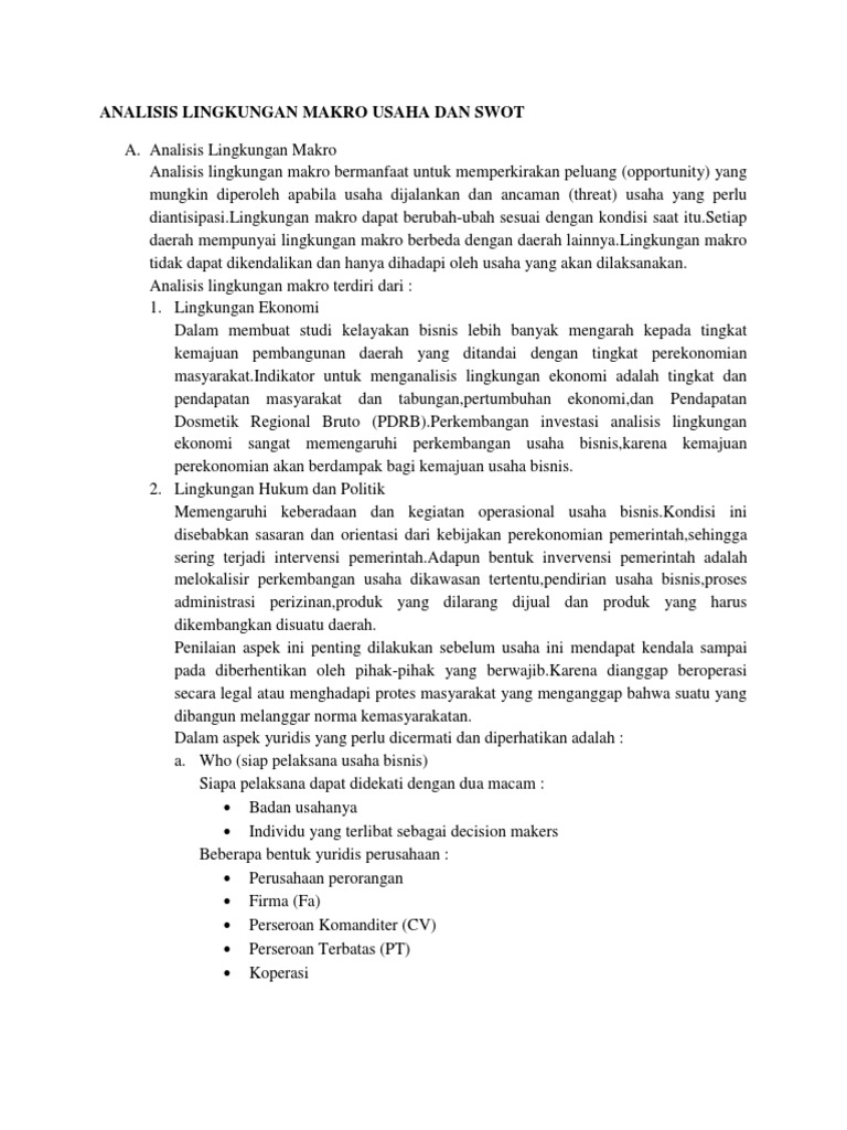 2.3 Hasil Analisis SWOT terhadap usaha bakso. Dari table diatas menunjukan bahwa nilai total skor dari masing-masing faktor dapat diperinci Strenghts 2,340, Weakness 0,48, Opportunesess 1,025, dan Threats 1,175. Maka diketahui nilai Strenghts diatas nilai Weakness selisih (+)1,860 dan nilai Opportunesess dibawah nilai Threath selisih (-)0,15. ANALISIS LINGKUNGAN BISNIS MAKRO Makalah Untuk memenuhi tugas individu mata kuliah Manajemen Strategik Oleh Hairum Rijal 031075333 Jurusan Manajemen Fakultas Ekonomi & Bisnis UPBJJ-Universitas Terbuka Kendari 2018 f KATA PENGANTAR Bimillahhirrohmannirrohim. Lingkungan makro adalah dinamis dan terus berubah dari waktu ke waktu. Globalisasi membuatnya sulit untuk menghindari guncangan eksternal terhadap bisnis domestik. Ekonomi juga terjalin dari satu negara ke negara lain. Guncangan di satu negara, seperti krisis 2008, menyebar ke negara lain. Contoh analisis lingkungan bisnis. Analisis lingkungan bisnis. Analisis lingkungan bisnis makro makalah untuk memenuhi tugas individu mata kuliah manajemen strategik oleh hairum rijal 031075333 jurusan manajemen fakultas ekonomi bisnis upbjj universitas terbuka kendari 2018 kata pengantar bimillahhirrohmannirrohim.