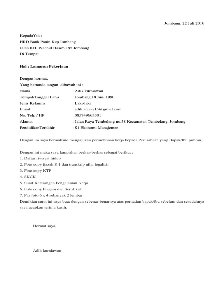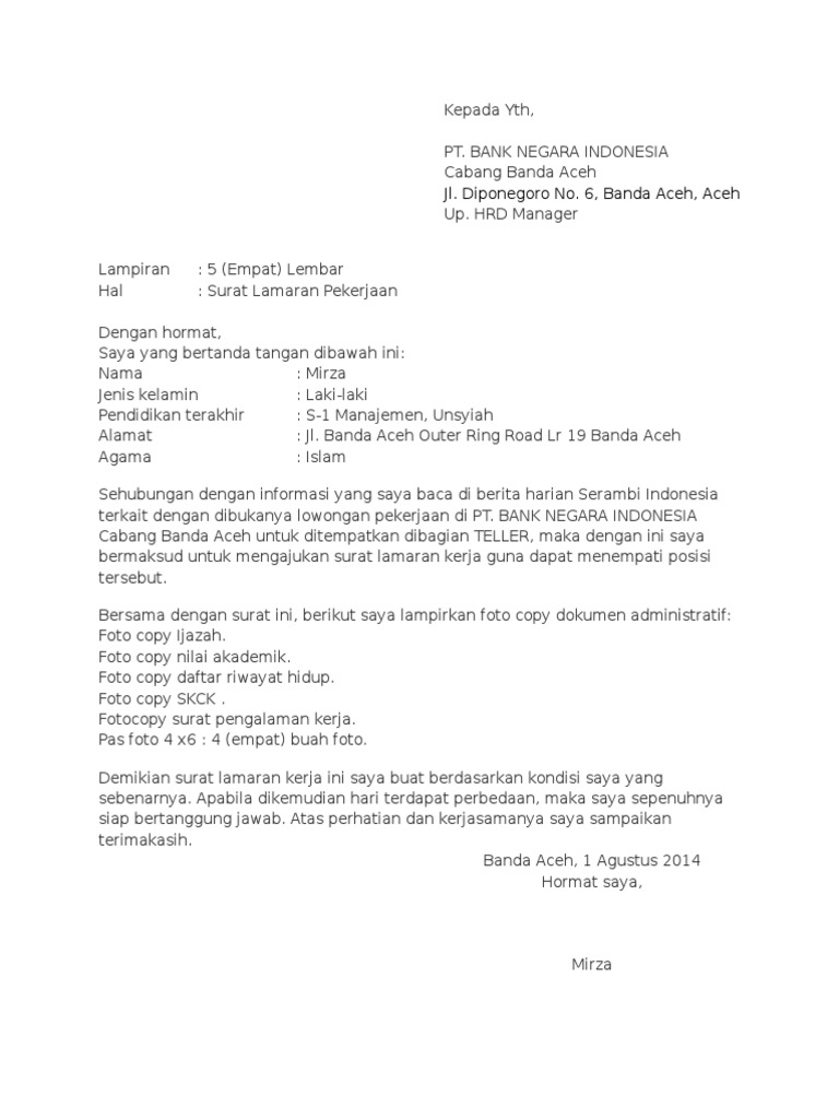 √ Contoh Surat Lamaran Kerja di Bank BNI, BCA, Mandiri, BRI ... Nov 22, 2021 · Contoh Surat Lamaran Kerja Di Bank sebenarnya tidak jauh berbeda dengan surat lamaran kerja pada umumnya. Yang membedakan hanya tujuannya yaitu untuk melamar kerja di bank. Seperti lamaran kerja pada umumnya, terdapat beberapa hal yang harus diperhatikan ketika menyusun Surat Lamaran Kerja, antara lain : Menyebutkan nama dan alamat bank yang ...