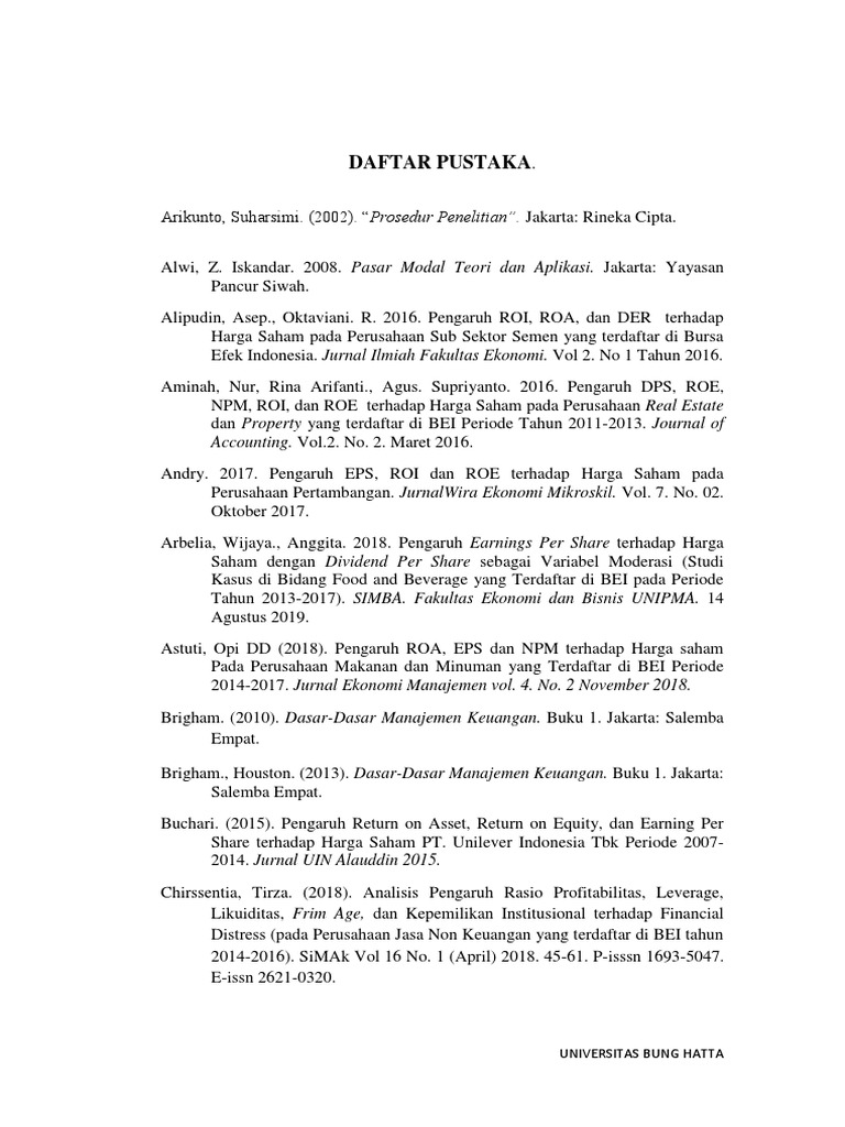 Pengaruh Roa, Der, Npm Terhadap Harga Saham Pada Sektor ... Faizal Ali Satriawan, Sri Utiyati. (2019). Pengaru ROA, DER, NPM Terhadap Harga Saham Pada Perusahaan Telekomunikasi. Jurnal Ilmu dan Riset Manajemen 8 (10) : 11. Fikri Zamzami, Nanu Hasanuh. (2021) Pengaruh Net Profit Margin, Return On Asset, Return On Equity dan Inflasi terhadap Harga Saham. Hanson Sainan, Phillip, Winson Halim. (2019). Pengaruh Kualitas Audit Dan Return on Asset (Roa) Terhadap ... Pengaruh ROA, Firm Size, EPS, dan PER Terhadap Return Saham pada Sektor Manufaktur, Jurnal Manajemen, Vol 7 No ). Nugroho, (2018). Analisis Faktor - Faktor yang Mempengaruhi Kualitas Audit Jurnal Maneksi, Vol 7 No. 2, Hlm 94-99. Pengaruh Per Eps Roa Dan Der Terhadap Harga Saham Lq45 Di ... pengaruh per eps roa dan der terhadap harga saham lq45 di bursa efek indonesia Effect of PER, EPS, ROA, and DER towards LQ45 share price in the Indonesia Stock Exchange. Under the guidance of Dr. Makmur, SE., M.SI as Supervisor I and Mr. Eko A. Widyanto, SE., M.SA as Advisor II. Pengaruh Net Profit Margin, Return ... - jurnal.polban.ac.id Pengaruh Earnings Per Share (EPS) dan Price Earnings Ratio (PER) Terhadap Harga Saham Sektor Perdagangan Besar dan Ritel Pada Periode 2000-2005 di Bursa Efek Indonesia. Jurnal Akuntansi, 7(2), 159-169. Husaini, A. (2012). Pengaruh Variabel Return On Assets, Return On Equity, Net Profit Margin dan earning Per Share Terhadap Harga Saham Perusahaan.