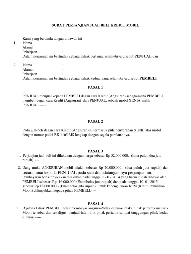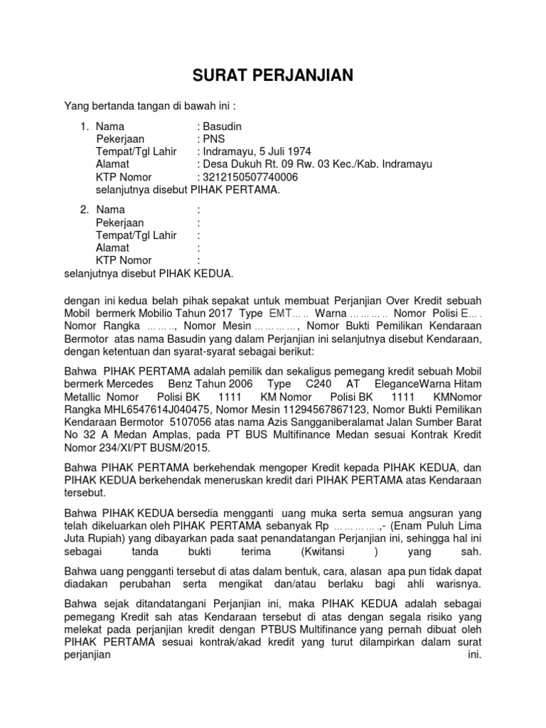 (DOC) SURAT PERJANJIAN over kredit | yunita astuni ... Dan mulai hari ini kendaraan tersebut yang diuraikan dalam surat perjanjian inimenjadi milik Pihak Kedua dan karenanya segala keuntungan dan kerugian yangdidapat dari Oper Kredit ini menjadi tanggung jawab sepenuhnya Pihak Kedua danPihak Pertama menjamin bahwa obyek oper kredit motor tersebut masih dalam angsuran. CONTOH SURAT PERJANJIAN KREDIT - Abdan-Syakuro.com CONTOH SURAT PERJANJIAN KREDIT - Surat Perjanjian kredit merupakan sebuah surat yang berisi sebuah perjanjian kesepakatan antara Debitur dengan Kreditur (dalam hal ini Bank) yang melahirkan hubungan hutang piutang, dimana Debitur berkewajiban membayar kembali pinjaman yang diberikan oleh Kreditur, dengan berdasarkan syarat dan kondisi yang telah disepakati oleh para pihak. Contoh Surat Perjanjian Jual Beli Kredit Handphone ... Format Contoh Surat Perjanjian Jual Beli Kredit Handphone yang Baik dan Benar 2019. Contoh Surat Perjanjian Jual Beli Kredit Handphone have an image from the other.Contoh Surat Perjanjian Jual Beli Kredit Handphone It also will feature a picture of a sort that may be seen in the gallery of Contoh Surat Perjanjian Jual Beli Kredit Handphone. The collection that comprising chosen picture and the ... Contoh Surat Perjanjian Jual Beli Motor ... - Ames Boston Contoh Surat Perjanjian Jual Beli Motor Secara Kredit Sementara untuk pembelian kendaraan yang dilakukan secara kredit atau angsuran, maka dalam isi surat perjanjian jual beli motor tersebut harus ditulisakan secara jelas, berapa uang muka yang diberikan dan juga berapa angsuran setiap bulan yang harus dibayarkan.