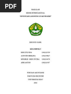 MAKALAH. BISNIS INTERNASIONAL INVESTASI LANGSUNG LUAR NEGERI. DISUSUN OLEH: KELOMPOK 5 DESI ZULVINA. 1302121519. AGUSTIN HERLINA. 1302156827. MUKHLIS DEDY PUTRA. 1302114470. AFRI ANTON. 1302111567. JURUSAN AKUNTANSI FAKULTAS EKONOMI UNIVERSITAS RIAU 2016. BAB I PENDAHULUAN 1.1 Latar Belakang Masalah Terbentuknya suatu negara memerlukan pengorbanan yang begitu keras, bagaimana agar bisa ...