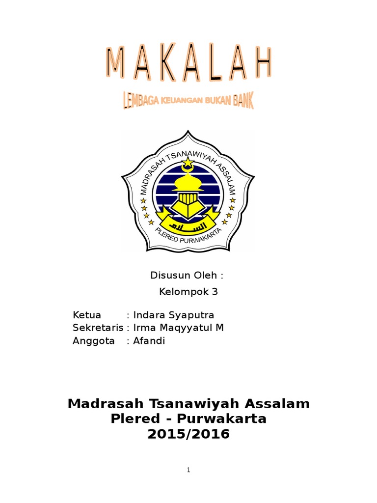 Makalah Lembaga Keuangan Bukan Bank.docx - Course Hero Puji syukur kami panjatkan kehadirat Tuhan Yang Maha Esa karena dengan rahmat, karunia, serta taufik dan hidayah-Nya kami dapat menyelesaikan makalah tentang Lembaga Keuangan Bukan Bank dengan baik meskipun banyak kekurangan didalamnya. Dan juga kami berterima kasih pada Ibu Ria Rahmawati, M.Pd selaku Dosen mata kuliah Dasar-Dasar Ekonomika yang telah memberikan tugas ini kepada kami.