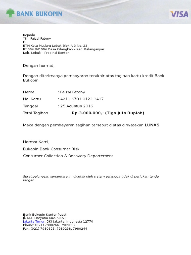 Mandiri Kartu Kredit perlindungan atas pelunasan tagihan kartu kredit. Sesuai dengan peraturan bank indonesia No. 14/2/PBI/2012 dan surat Edaran Bank Indonesia No. 14/17/DASP mengenai Penyelengaraan Kegiatan Alat Pembayaran Dengan Menggunakan Kartu. Solusi Kartu Kredit Apakah anda memiliki hutang kartu kredit atau Kredit Tanpa Agunan dan pusing dengan pembayaran yang tidak 2. Pelunasan: Discount s/d 50% dari total hutang saat negosiasi (Penjelasan lengkap silahkan klik disini). Surat-surat akan kami buat dan kirim via TIKI JNE ke alamat anda. Kartu Kredit - Pengertian, Ciri, Jenis, Fungsi & Cara Kerja Kartu Kredit - Pengertian, Jenis, Ciri, Fungsi, Syarat, Cara Kerja, Keuntungan & Kerugian - Untuk pembahasan kali ini kami akan mengulas mengenai Kartu Kredit yang dimana dalam hal ini meliputi pengertian, jenis, ciri, fungsi, syarat, cara kerja, keuntungan dan kerugian, nah untuk lebih dapat... Permohonan Pengiriman Bukti Pelunasan Kartu Kredit BCA | KASKUS Kepada Yth Divisi Kartu Kredit Bank BCA. Saya mohon surat bukti pelunasan kartu kredit atas nama MOCH RIDWAN SENTOSA dgn No Customer 14474526 segera dikirimkan ke pada saya. Karena itu adalah hak saya untuk menerima surat tersebut.