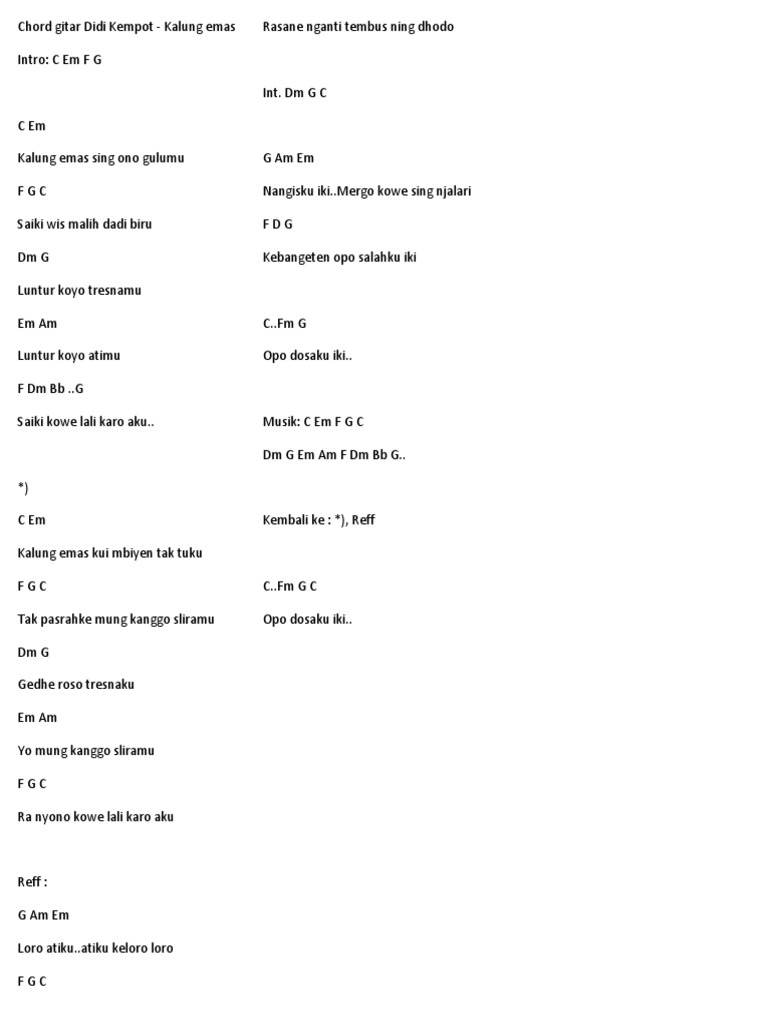 Lagu Kalung Emas berkisah tentang seseorang yang dilupakan oleh seseorang yang sangat dicintai. Chord gitar dan lirik lagu Kalung Emas - Didi Kempot : • Download Lagu Nella Kharisma - 20 Gudang Lagu Dangdut Koplo Mp3. • Download Lagu Faded Alan Walker, Gudang Musik Beserta Video dan Lirik Where Are You Now. Intro: C Em F G.