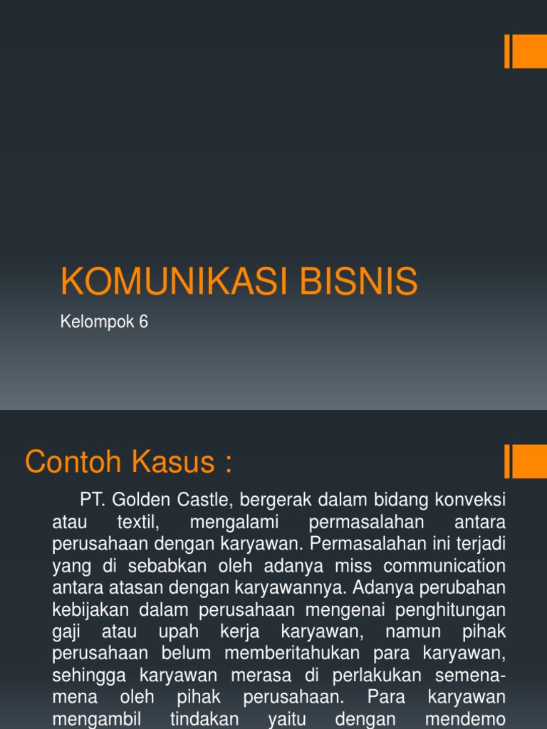 Contoh kasus dalam dunia bisnis (TUGAS KOMUNIKASI BISNIS) 5. Rizki. Komunikasi bisnis adalah pertukaran gagasan , pendapata, informasi , instruksi yang memiliki tujuan tertentu yang disajikan secara personal atau impersonal melalui simbol - simbol atau sinyal . Contoh kasus : PT Golden Castle , bergerak dalam bidang konveksi atau textil, mengalami permasalahan antara perusahaan dengan karyawan.