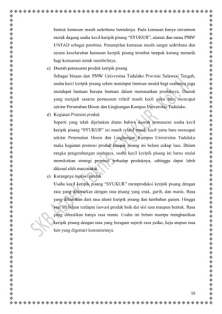 PDF Proposal Studi Kelayakan Bisnis Usaha Toko Buah Impor ... STUDI KELAYAKAN BISNIS USAHA TOKO BUAH IMPOR ; "MyFruits" Disusun oleh : 1. Amalia Charitsah NIM 152040044 2. Yulita Erlina Lantha NIM 152040050 3. Nuraini NIM 152050029 4. Danang Ronggo Sasmito NIM 152050030 5. Riyani NIM 152050062 JURUSAN ILMU ADMINISTRASI BISNIS FAKULTAS ILMU SOSIAL DAN ILMU POLITIK Makalah penelitian studi kelayakan bisnis (studi kasus ... Makalah penelitian studi kelayakan bisnis (studi kasus usaha kecil keripik pisang syukur) kel. 2. 1. BAB I PENDAHULUAN A. LATAR BELAKANG Buah pisang merupakan salah satu buah tropis, buah pisang membutuhkan banyak sinar matahari untuk dapat tumbuh subur dan berbuah. Pohon pisang banyak tumbuh di Indonesia, karena letak geografis Indonesia yang ...