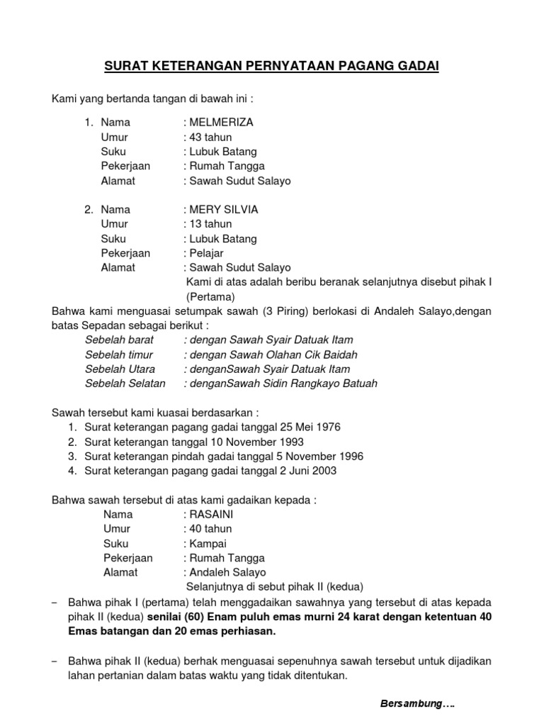 Contoh Surat Gadai Sawah - Contoh Surat Info Contoh Surat Perjanjian Gadai Sawah Surat 6. You merely have to go through the gallery below the Contoh Surat Gadai Sawah picture. We offer image Contoh Surat Gadai Sawah is comparable, because our website focus on this category, users can find their way easily and we show a straightforward theme to find images that allow a user to find ... Cara Membuat Surat Perjanjian Gadai Sawah di MS Word - YouTube Assalamualaikum Wr. Wb.Video ini berisikan tentang Cara Membuat Surat Perjanjian Gadai Sawah di MS Word yang sederhana dan mudah.Jika ada saran dan kritik bo... Contoh Surat Gadai Tanah Dan Sawah Lengkap, Baik dan Benar ... Dengan surat gadai sah ini, penggadai dan pemberi gadai biasanya akan menyetujui masalah periode waktu pembayaran pelunasan pembayaran dan langkah pembayaran object gadai itu. Dengan begitu, penggadai bisa membayarnya dengan tepat waktu seperti persetujuan. Contoh Surat Gadai Tanah
