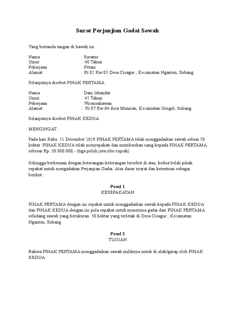 Surat Perjanjian Penggadaian Sawah | PDF - Scribd SURAT PERJANJIAN PENGGADAIAN SAWAH. Yang bertandatangan di bawah ini: Nama : Djunaedi Wardono Tempat/ Tgl Lahir : Alam at : NO. KTP. : Selanjutnya disebut PIHAK PERTAMA Yang bertandatangan di bawah ini: Nama : Nadi bin Enyim Tempat/ Tgl Lahir : Purwakarta, 10 Februari 1954 Alam at : Kampung Cintakarya Rt 013/05, Cikopo, Bungursari, Jabar NO. KTP. : 32.14.13.10.02.54.0003 Selanjutnya disebut ...