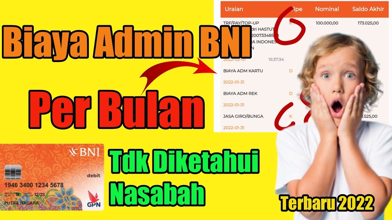 Lengkap, Rincian Biaya Admin Tabungan BNI dan Bunga Per Bulan Biaya admin BNI per bulan rekening di bawah saldo rata-rata harian minimum: Rp 20.000. Selain 3 jenis tabungan yang sudah disebutkan di atas, Bank BNI juga menyediakan produk simpanan lainnya antara lain BNI Tappa, BNI Taplus Muda Co-Brand, BNI Taplus Anak, BNI Taplus Anak Co-Brand...