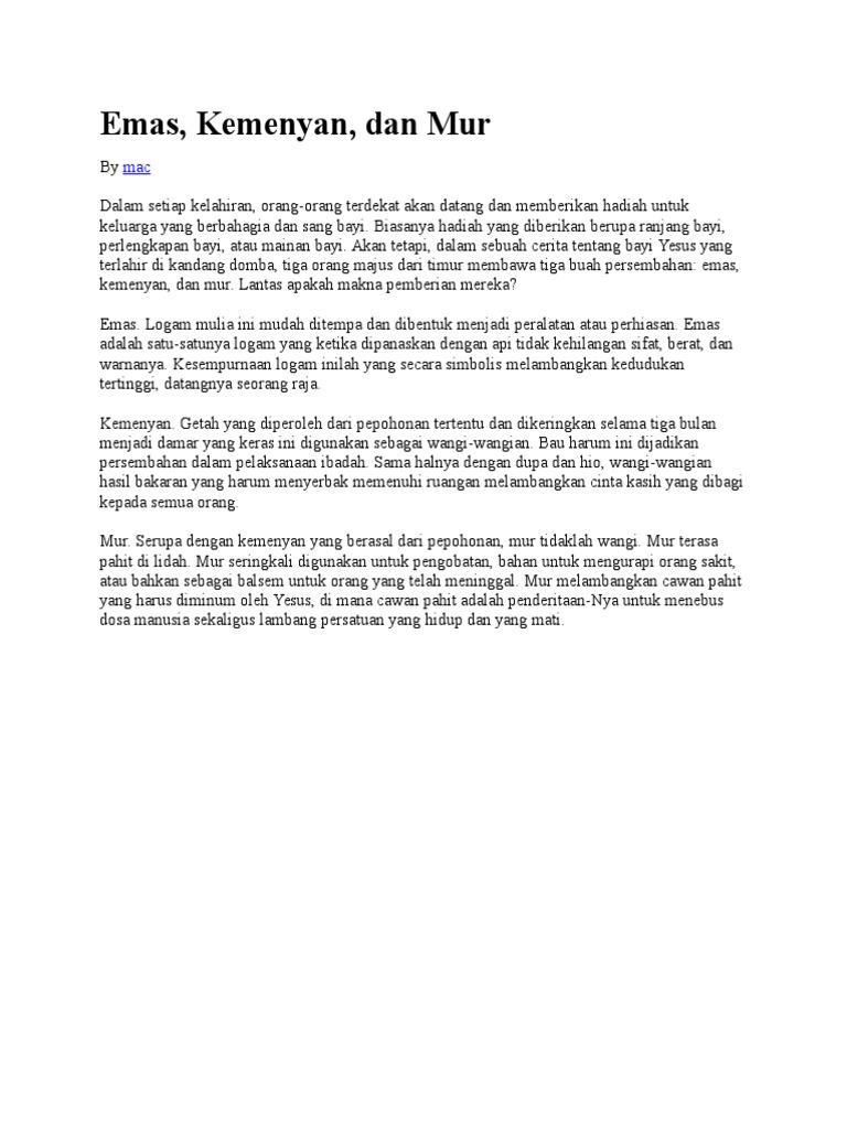 Belajar dari Emas Kemenyan dan Mur - Sebuah Refleksi Natal Emas Kemenyan dan Mur Sebuah Refleksi Natal Lantas, setelah menempuh perjalanan yang panjang, orang-orang Majus itu tiba dan bertemu dengan Yesus. Seorang bayi mungil bersama dengan orangtuanya. Mereka memberikan persembahan berupa emas kemenyan dan mur sebagai tanda penghormatan mereka kepada Raja Orang Yahudi yang baru saja lahir.