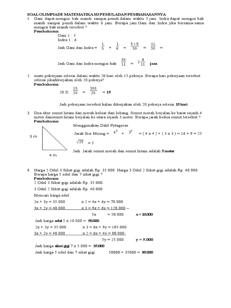 (PDF) pembahasan contoh soal olimpiade matematika SD Berikut merupakan pembahasan beberapa contoh soal olimpiade matematika tingkat SD. Perlu diingat bahwa cara menjawab yang diberikan hanyalah alternatif saja, selaku guru/pembimbing Anda dapat menyesuaikan dengan kemampuan siswa.