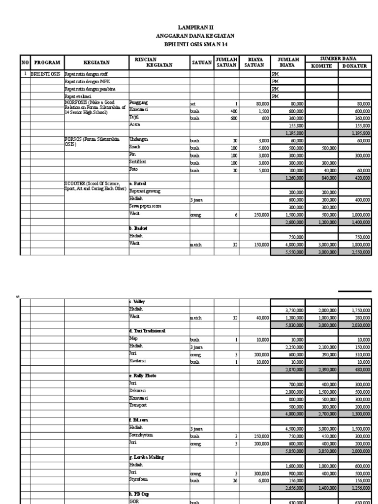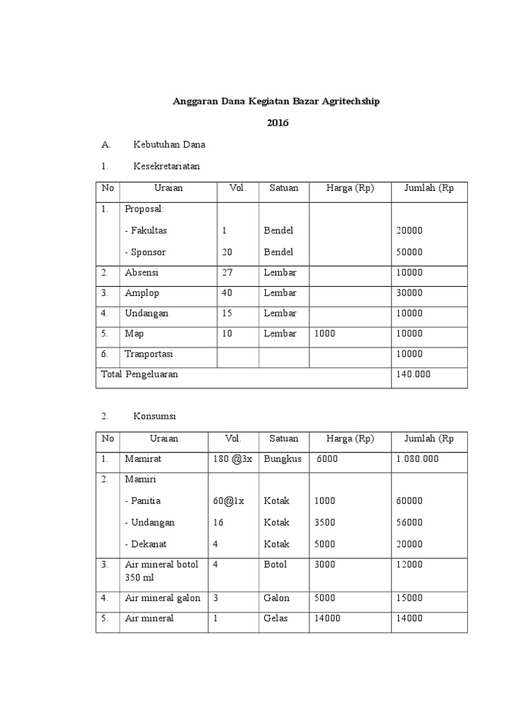 Contoh anggaran dana proposal kegiatan. Contoh Proposal Kegiatan Event (Sponsorship), Wirausaha dan Bisnis Contoh Proposal Kegiatan - Hay sobat sharing.. Ketika berkecimpung di dunia organisasi pasti kamu akan banyak membahas mengenai proposal, atau bahkan terlibat dalam pembuatannya. Mereka sering membuat proposal untuk menggalang bantuan dan dukungan atas kegiatan yang... 9+ Contoh Proposal Kegiatan Sekolah / OSIS / Kampus / Desa... Contoh Proposal Kegiatan - Proposal adalah sejenis rangkaian kegiatan yang tertulis dan di dalamnya mencakup rancangan kerja. Adapun rancangan anggaran untuk kegiatan ini adalah sekitar 70,000,000 rupiah. Semuanya sudah terhitung di rancangan ini termasuk untuk dana tak... Download Contoh Proposal Pengajuan Dana [Word, PDF] Contoh judul dengan nama kegiatan seperti "Proposal Kegiatan Edu Fair 2019 SMA Negeri 12 Jakarta", "Proposal Kegiatan Sekolah Pekan Menyusun anggaran dana ini memang sedikit ribet karena kamu benar-benar harus memikirkan apa saja yang akan dibutuhkan serta estimasi biayanya. 13+ Contoh Proposal yang Benar ( Usaha, Kegiatan Sekolah...) Contoh Proposal - Proposal merupakan sejenis serangkaian kegiatan yang ditulis dimana di dalamnya memiliki cakupan rancangan kerja. Rancangan kerja yang terdapat di dalam suatu proposal tersebut nantinya akan dilakukan sebagai sebagai sebuah program.