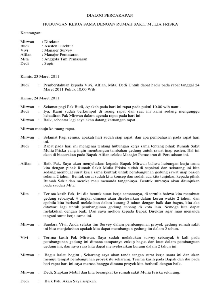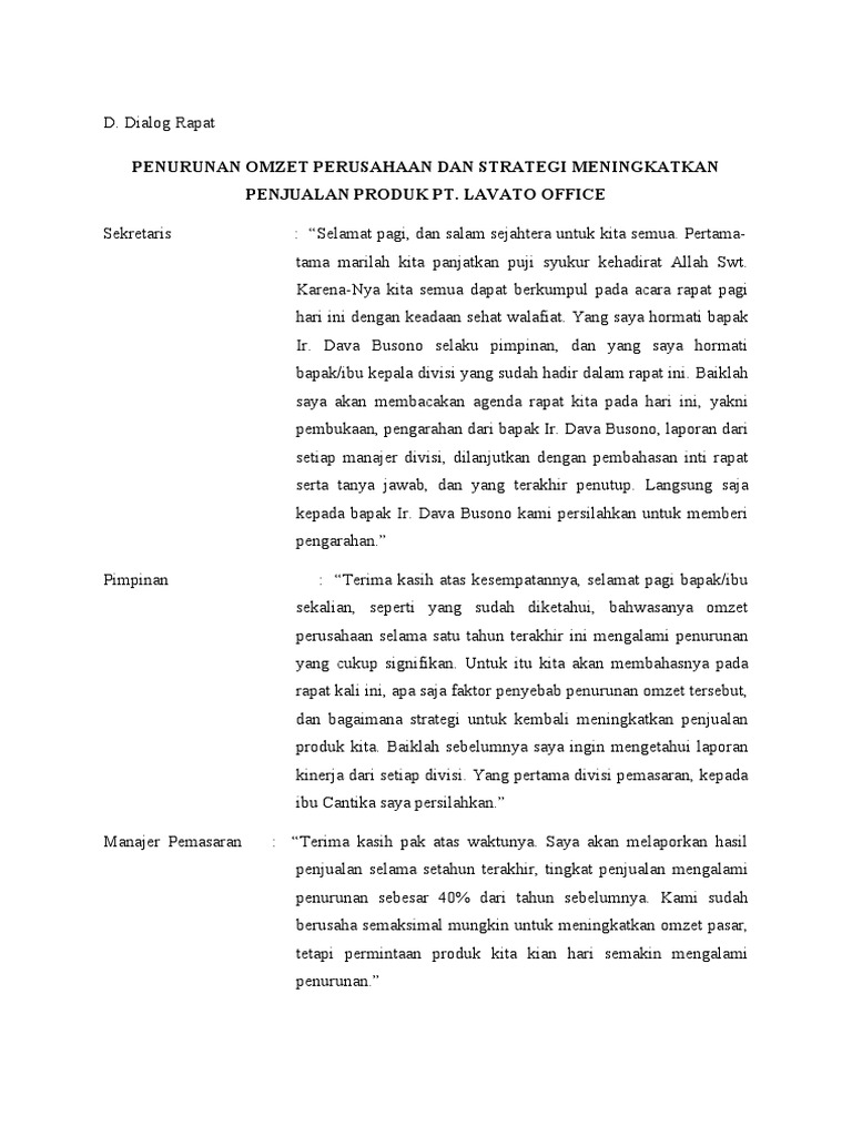 9+ Contoh Dialog Interaktif Singkat beserta Kesimpulan ... 4.1 Contoh teks dialog interaktif singkat. 4.2 Contoh dialog interaktif acara hitam putih terbaru. 4.3 Contoh dialog interaktif 2019 Beserta kesimpulannya. 4.4 Contoh dialog interaktif beserta kesimpulan di tv one. 4.5 Contoh dialog interaktif singkat tentang pendidikan. 4.6 Contoh dialog interaktif singkat tentang kebersihan. Contoh Dialog Rapat Managemen Pemasaran | Iconoclast contoh dialog rapat managemen pemasaran; teks eksplanasi (materi bahasa indonesia kurikulum... teks cerita ulang (materi bahasa indonesia kurikul... laporan hasil kunjungan di pabrik perusahaan batik... 2014 (1) februari (1) TUGAS 3 KOMUNIKASI BISNISx.docx - CONTOH RAPAT BISNIS ... view tugas 3 komunikasi bisnisx.docx from tugas 3 at terbuka university. contoh rapat bisnis fakultas ekonomi jurusan ekonomi manajemen universitas terbuka rapat kinerja perusahaan Udin Bandeng: Dialog Rapat Mengenai Marketing Berikut dialog rapat yang telah saya presentasikan bersama teman-teman saya, semoga membantuuu,, << Contoh Rapat >> Obrolan Telepon. Direktur : Selamat pagi Bu widia, saya bu darni dari bagian manager Produksi . ...
