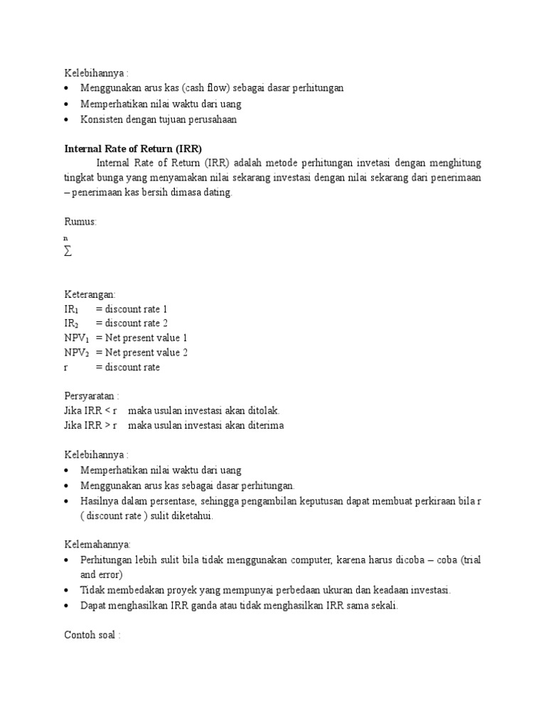 lifepal.co.id › media › irrPahami Internal Rate of Return, Penghitungan, dan Contohnya Nov 11, 2019 · C0 = Nilai investasi awal tahun ke-0 (dalam rupiah) r = suku bunga atau discount rate (dalam persen) Secara sederhana, NPV adalah nilai proyek yang sedang dikerjakan, diperoleh dari selisih antara arus kas yang dihasilkan terhadap investasi yang dikeluarkan. Bila nilai NPV > nol, maka investasi atau proyek dianggap layak (feasible) untuk dilakukan.