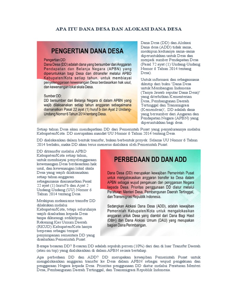 Pengertian alokasi dana desa. Apa itu Dana Desa dan Alokasi Dana Desa ? - Updesa Selanjutnya untuk pengertian Alokasi Dana Desa atau disingkat (DD) diatur dalam Peraturan Pemerintah nomor 43 tahun 2014, pasal 1 angka 9 yang berbunyi sebagai berikut : Alokasi Dana Desa adalah dana perimbangan yang diterima Kabupaten/Kota dalam Anggaran Pendapatan dan Belanja... e-journal.upp.ac.id › index › sungkaiSTRATEGI PENGEMBANGAN POTENSI DESA - UPP alokasi dana khusus. Pusat melakukan fasilitasi, supervisi dan akselerasi Regulasi menetapkan kewenangan skala desa, melembagakan pperencanaan desa, alokasi dana dan kontrol lokal Pemegang kewenangan Pemerintah daerah Desa (pe merintah desa dan masyarakat) Dalam pengembangan wilayah, kawasan perdesaan harus dipandang PDF Optimalisasi perencanaan dan pelaksanaan Alokasi Dana Desa menjadi peran penting bagi pembangunan dan kemajuan suatu desa untuk menunjang keberhasilan mengenai Optimilisasi Alokasi Dana Desa Dalam meningkatkan Pembangunan Desa studi di desa Nahepese kecamatan manganitu. jurnal ( 2017), h. 3-4. Pengertian ADD (Alokasi Dana Desa) - Desana Urang Pengertian ADD (Alokasi Dana Desa). ADD atau alokasi dana desa adalah anggaran yang dikucurkan untuk desa dari pemerintah ditingkat kabupaten, Anggaran ini bersumber dari APBD kabupaten.