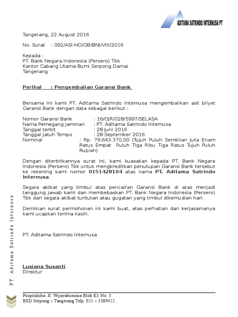Contoh Surat Permohonan Bank Garansi Bni Admin dari blog Bagikan Contoh 2019 juga mengumpulkan gambar-gambar lainnya terkait contoh surat permohonan bank garansi mandiri dibawah ini. Apabila anda membutuhkan referensinya silahkan langsung menuju postingan tersebut. Contoh Surat Permohonan Garansi Bank Bni.