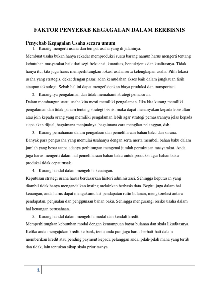 39 hal apa saja yang menyebabkan pelaku bisnis mengalami ... 39 hal apa saja yang menyebabkan pelaku bisnis mengalami kegagalan. 6 Faktor Penyebab Kegagalan Dalam Bisnis Dan Usaha Bagi setiap pelaku bisnis yang memiliki pengalaman panjang, sepertinya mereka sudah bukan hal baru lagi menemui titik terpuruk atau setidaknya pernah mengalami kegagalan. Namun hingga pada akhirnya mereka tetap mampu bertahan ...