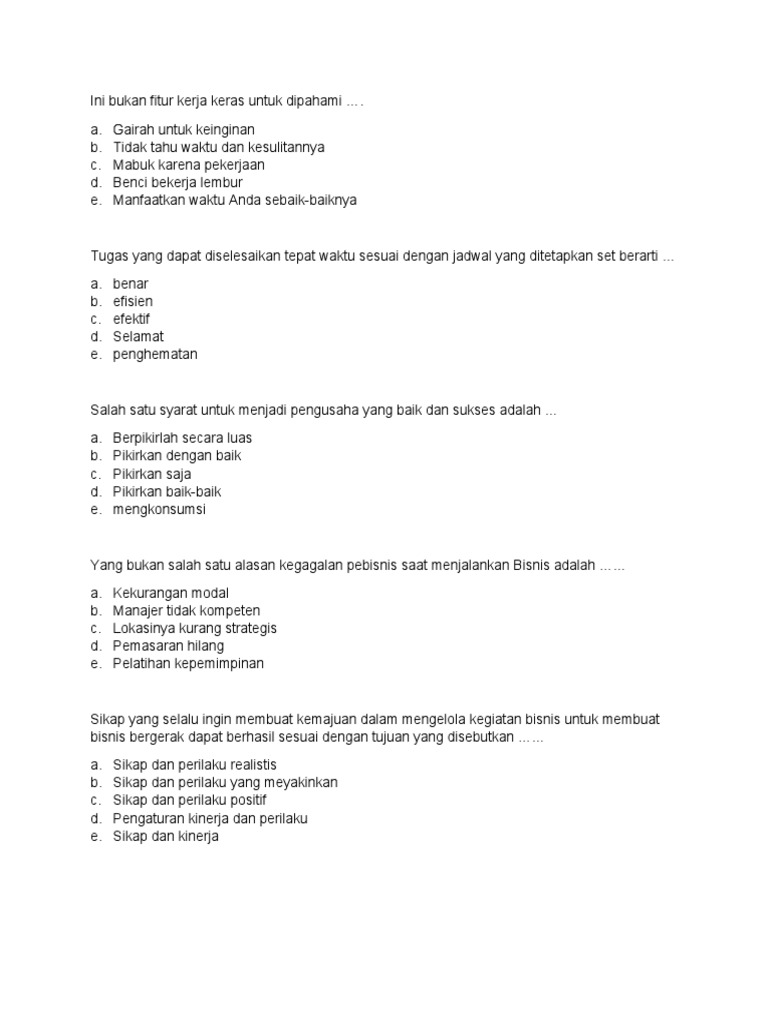 PAT PKWU X.docx - 1. Ini bukan fitur kerja keras untuk ... Yang bukan salah satu alasan kegagalan pebisnis saat menjalankan Bisnis adalah ... Faktor-faktor yang tidak mendukung kesuksesan bisnis adalah ... Saya enggan belajar dari kegagalan c. Selalu pesimis saat dimulai d. Memiliki komitmen tinggi e.
