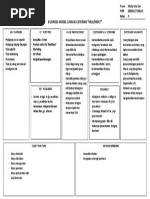 Pengertian Bisnis Model Canvas, Fungsi, Contoh - DonaBisnis Dengan contoh bisnis model kanvas, dapat dilihat bahwa blok yang ada dalam model bisnis kain cukup mudah dimengerti. Selain mudah dimengerti, ada beberapa keunggulan model kanvas untuk bisnis. Keunggulan ini termasuk; 1. Mempersingkatkan Penulisan. Dengan menggunakan bisnis model canvas, pelaku bisnis akan mempersingkat waktu penulisan model ... Contoh Business Model Canvas dan Cara ... - Paper.id Blog Sebagai contoh business model canvas untuk revenue stream, Anda bisa melihat dari mana saja sumbernya, seperti dari supermarket/toko/lainnya. Anda bisa menggambarkan saluran keuntungan berdasarkan effort yang telah Anda lakukan. Dengan begitu, hal ini penting agar Anda dapat memantau pemasukan secara transparan. 43 contoh bisnis model kanvas kuliner - Kelola Dana Anda Contoh bisnis model kanvas kuliner. 9 Elemen Bisnis Model Canvas. Berikut beberapa elemen bisnis model canvas, antara lain: 1. Customer Segment. Customer segment atau segmentasi pelanggan. Maksudnya, sebelum menjalankan bisnis, Anda harus menentukan dulu siapa konsumen yang akan membeli produk Anda. Contoh Makalah Bisnis Model Canvas Makanan - Kondisko Rabat Salah satu contoh bisnis model kanvas makanan adalah dengan membuka usaha strawberry. Tujuannya adalah membuat makanan sehat yang berasal dari buah strawberry yang segar. BUSINESS MODEL CANVAS BMC BMC merupakan salah satu alat untuk membantu kita melihat lebih akurat bagaimana rupa usaha yang sedang atau kita akan jalani.