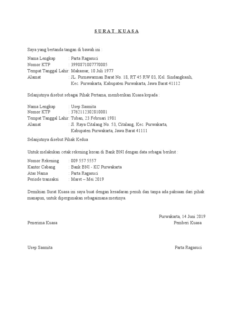 (DOC) SURAT KUASA BNI upload | Wanda Aceh - Academia.edu Bank Negara Indonesia (Persero) dengan data sebagai berikut : 1. Nomor Perjanjian Kredit : 2000.100/BNI FLEKSI 2. Nomor Aplikasi Kredit : 1234567890 tanggal 12 Desember 2013. Demikian SURAT KUASA ini saya buat dengan sesungguhnya untuk dapat dipergunakan seperlunya. 8 Contoh Surat Kuasa Pengambilan Uang di Bank (Download ... Surat kuasa pengambilan uang di bank baik itu perorangan atau organisasi, wajib hukumnya untuk mencantumkan data diri secara lengkap. Data diri itu sendiri seperti nama lengkap, tempat dan tanggal lahir, nomor identitas, dan nomor telepon baik dari pemberi maupun penerima kuasa. Tujuan Surat Dibuat Contoh Surat Kuasa Bank BNI untuk Mengurus Kartu ATM ... Contoh Surat Kuasa Bank BNI untuk Mengurus Kartu ATM. Contoh Surat Kuasa Bank BNI untuk Mengurus Kartu ATM dapat kamu unduh secara lengkap dan gratis pada link di bawah ini : Download [13.43 KB] Contoh Surat Kuasa Bank BNI untuk Mengurus Kartu ATM Download. Info Lengkap : Contoh Surat Kuasa Bank BNI untuk Berbagai Keperluan.