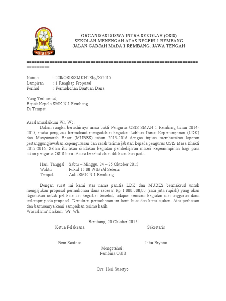 Contoh Surat Pengajuan Anggaran Biaya Lengkap Dan Bisa Di Edit contoh surat permohonan dana kegiatan kampus. 3. Contoh Surat Permohonan Bantuan Dana Kegiatan. ORGANISASI SISWA INTRA SEKOLAH. SMK N 1 Jember Jalan Gajahmada 1 Patrang Nomor : 020/OSIS/SMKN1Jbr/X/2011 Lampiran : 1 Rangkap Proposal Perihal : Permohonan Bantuan Dana. Yang Terhormat, Bapak Kepala SMK N 1 Jember Di Tempat. Assalamu'alaikum Wr. Wb.
