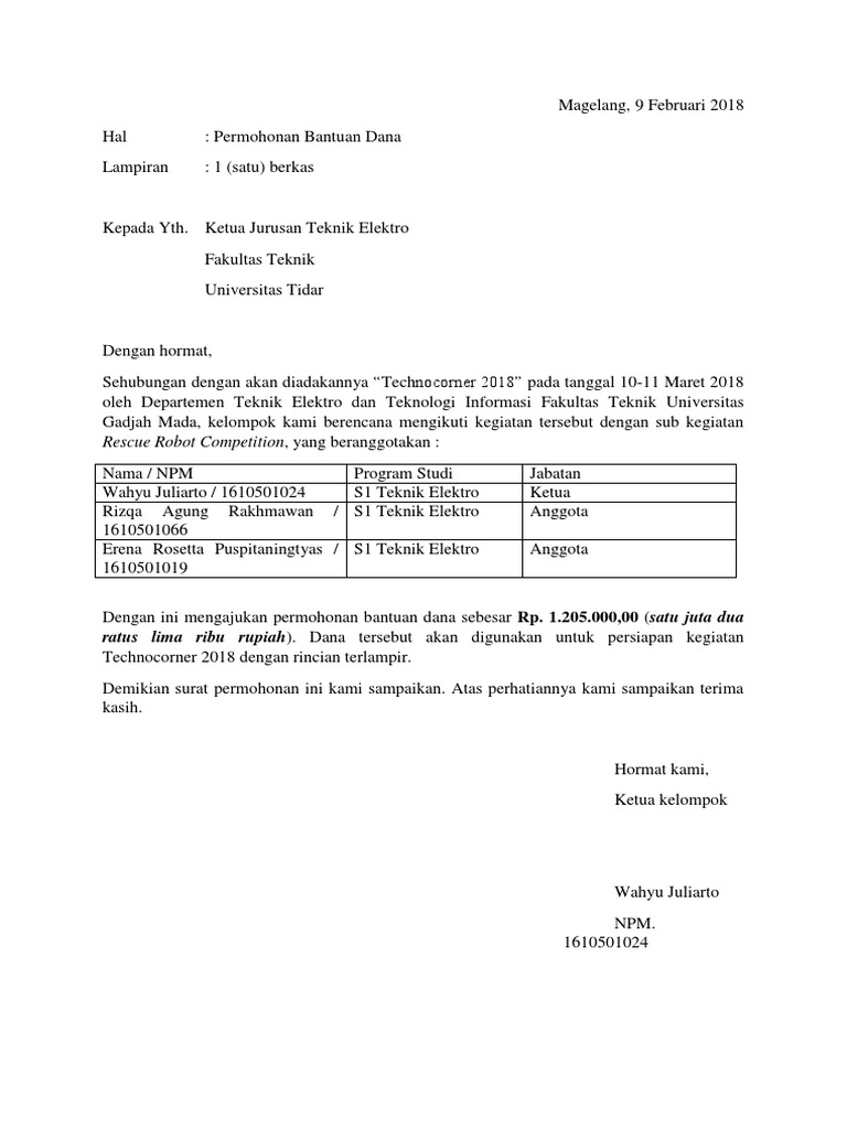 Contoh Surat Permohonan Dana Kegiatan Contoh Surat Permohonan Dana Kegiatan - Surat permohonan dana merupakan salah satu contoh surat resmi yang berfungsi sebagai surat untuk meminta bantuan dana secara tertulis dari suatu instansi ataupun organisasi kepada orang banyak umum baik di dalam ruang lingkup tertentu atau masyarakat luas. 001 hut ri 1995 malang 16 juli 1995.