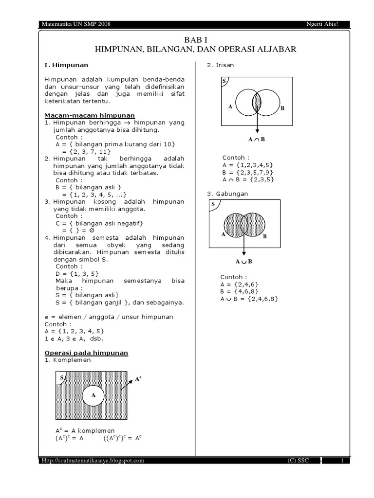 FREE BIG BANK SOAL UN MATEMATIKA SMP - PDF Free Download BIG BANK SOAL UN MATEMATIKA SMP 1992-2012 Media Guru Publishing gurugalau.wordpress.com Gratis download: gurugalau.wordpress.com MATEMATIKA EBTANAS TAHUN 1992 EBT-SMP-92-01 Diketahui: A = {m, a, d, i, u, n} dan B = {m, a, n, a, d, o} Diagram Venn dari kedua himpunan di atas adalah … A. B. a i u m d e a o e a a I u m d n e o m n a i u e