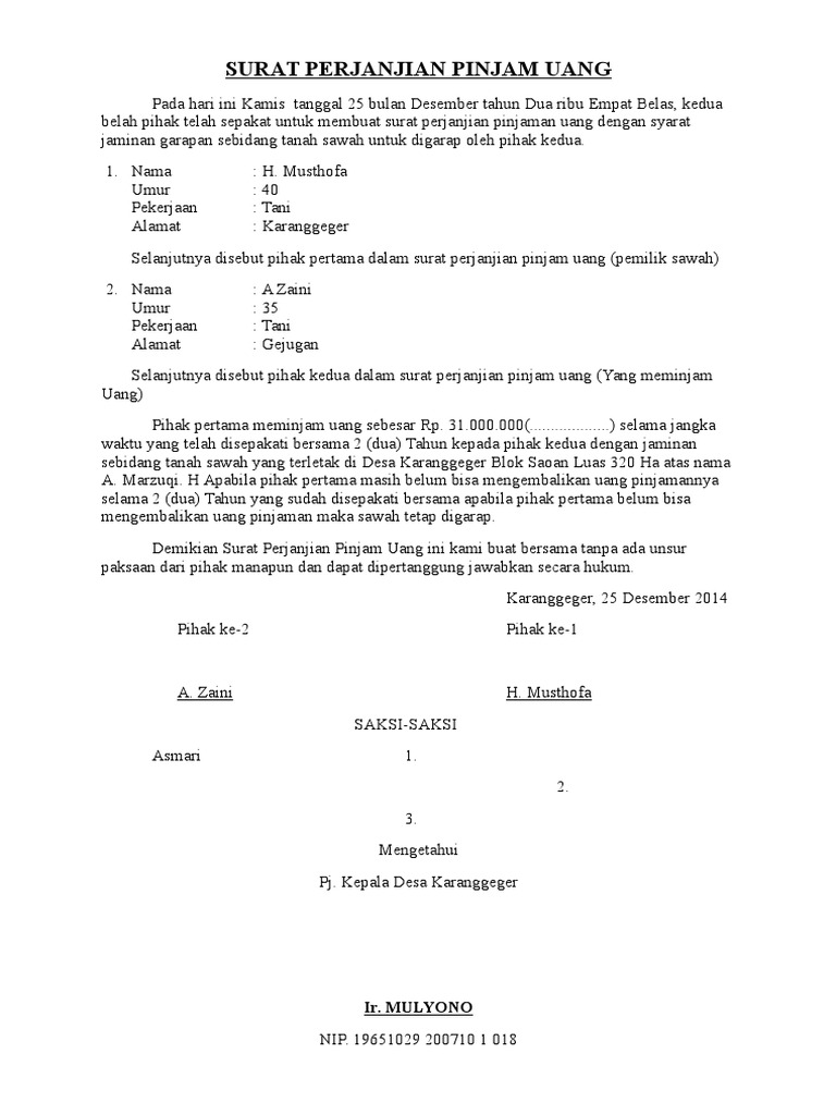Contoh Surat Pinjaman Uang yang Benar - Contohsurat Misalnya seperti tidak membayar secara lunas uang pinjaman, melarikan uang pinjaman, telat membayar uang pinjaman, tau hal lain sebagainya yag bersifat merugikan. Dan jika hal yang tidak diinginkan terjadi, kita bisa melaporkannya ke pihak yang berwajib untuk dibwa ke jalr hukum, dan surat pinjaman ini adalah buktinya. 4 Contoh Surat Pernyataan Hutang yang Bisa Ditiru, Efektif ... Tidak ketinggalan, mengenai contoh surat perjanjian hutang piutang dan contoh surat perjanjian hutang. Sejumlah Contoh Surat Pernyataan Hutang 1. Contoh Surat Pernyataan Hutang Individu. Kalau kamu meminjamkan uang kepada orang lain tanpa memakai jaminan atau syarat khusus, kamu bisa menggunakan contoh ini. Selain itu, contoh surat ini juga ... Contoh Surat Perjanjian Pinjaman - Kumpulan Contoh Surat ... Contoh Surat Perjanjian Pinjaman - Surat perjanjian pinjaman juga dapat menjadi tanda bukti di kemudian hari apabila ternyata terdapat perselisihan paham antara kedua belah pihak. Contoh surat perjanjian pinjaman. Namun agar lebih terstruktur dan memiliki bukti fisik maka kedua belah pihak biasanya akan menggunakan surat perjanjian.