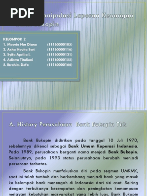 Kasus Bank Bukopin [on2ggv1jr340] - idoc.pub Kasus Bank Bukopin. ANALISIS TANGGUNGJAWAB AUDITOR TERHADAP KASUS BANK BUKOPIN BERDASARKAN STANDAR PROFESIONAL AKUNTAN PUBLIK (SPAP) Modifikasi laporan keuangan bukan merupakan hal baru dalam industri perbankan di Indonesia. Kasus terbaru dari modifikasi laporan keuangan ini muncul di PT Bank Bukopin Tbk (BBKP) yang merevisi laporan keuangan ...